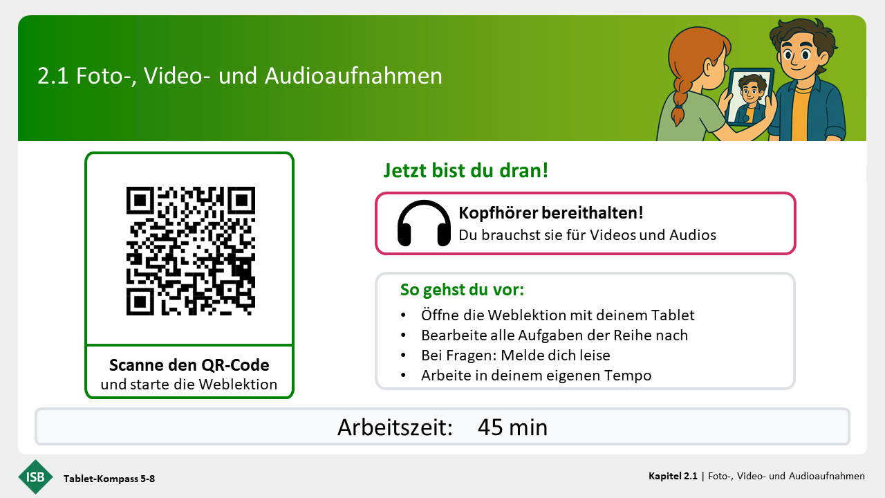 Die Weblektion „Foto-, Video- und Audioaufnahmen“ ist so gestaltet, dass sie den Lernenden sowohl die notwendigen Fertigkeiten im Umgang mit dem Tablet vermittelt, als auch die Einsatzmöglichkeiten aufzeigt. Daher ist es zu empfehlen, alle Abschnitte zu bearbeiten.