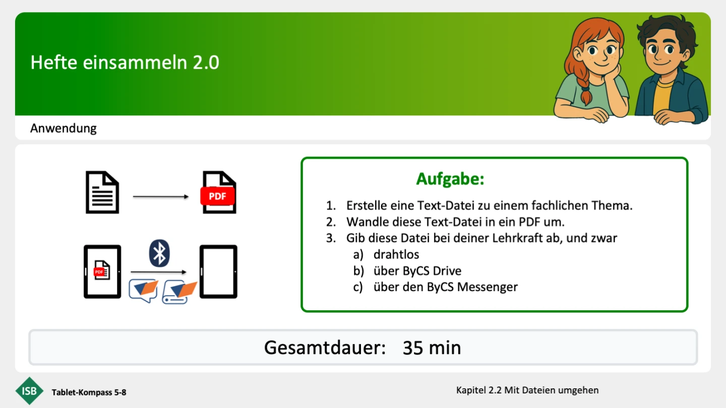Die Lernenden erstellen selbst eine Text-Datei. Anschließend wandeln sie diese Datei in eine PDF-Datei um und geben diese über Bluetooth oder E-Mail bei der Lehrkraft ab.