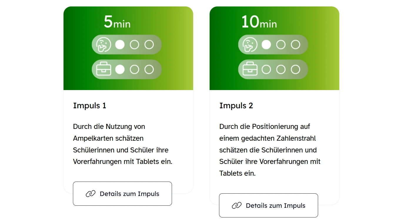 Die Karten zu den Umsetzungsvarianten bieten Ihnen eine schnelle Orientierung bezüglich Dauer, Grad der kognitiven Aktivierung und Materialaufwand. Je mehr Punkte angezeigt werden, desto höher ist die jeweilige Anforderung. So können Sie schnell die Variante auswählen, die am besten zu Ihrer Unterrichtssituation passt.
