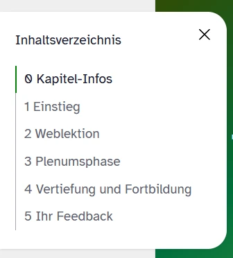 Jedes Kapitel folgt einer einheitlichen Struktur, die Ihnen die Unterrichtsplanung erleichtert. Den Auftakt bilden die Kapitel-Infos mit einer Planungsübersicht, in der Kompetenzerwartungen und Inhalte kompakt zusammengefasst sind. Darauf folgen vier aufeinander aufbauende Elemente: Der Einstieg bietet mehrere Impulse zur Auswahl, gefolgt von der Weblektion als verbindlichem Kern. In der anschließenden Plenumsphase werden verschiedene Varianten zur gemeinsamen Vertiefung vorgestellt. Das Element Vertiefung und Fortbildung bietet zusätzliches Material und weiterführende Hinweise. Abschließend können Sie im Abschnitt Ihr Feedback Rückmeldungen zur Umsetzung geben.