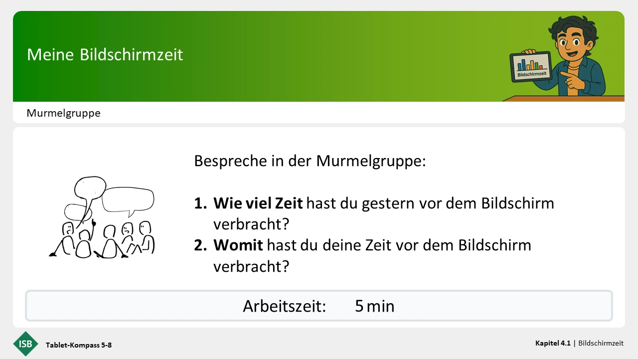 In einem Murmelgespräch tauschen sich die Schülerinnen und Schüler in 2-3er-Teams über ihre tägliche Bildschirmzeit aus. Die Methode regt zu einer kurzen individuellen Reflexion an.