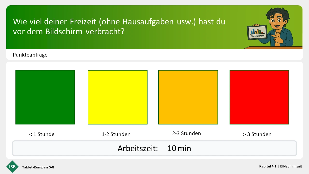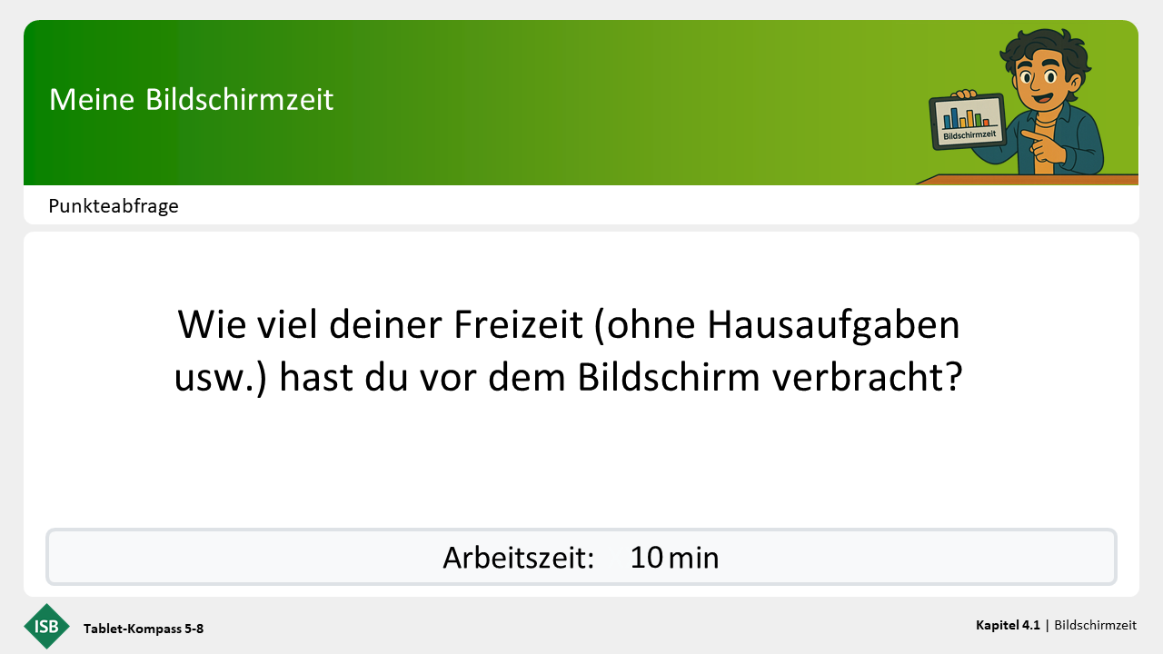 Leitfrage: “Wie viel Zeit hast du gestern vor einem Bildschirm verbracht? Womit hast du deine Zeit am Bildschirm verbracht?”