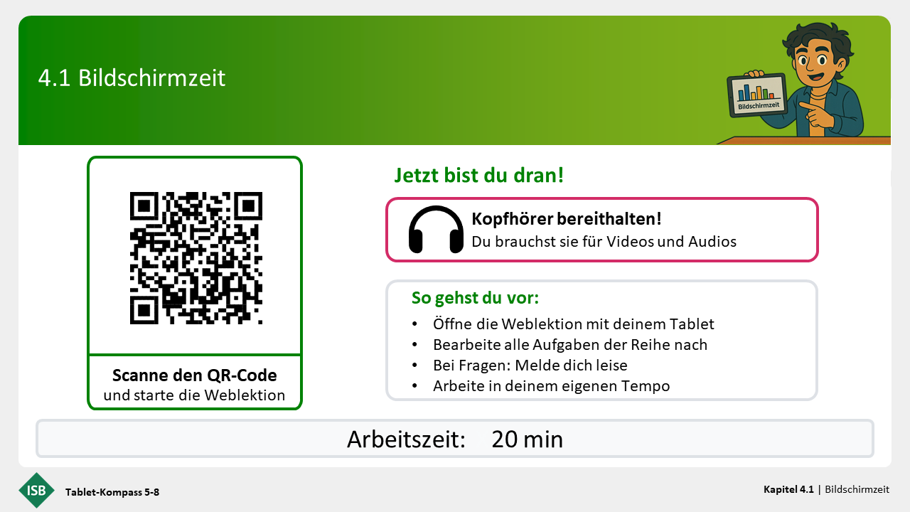 ⏱️ Planen Sie für die Bearbeitung des gesamten Kapitels min. 45 min. ein. Die Bearbeitungsdauer der Weblektion beansprucht ca. 20 Minuten. Im Anschluss bleibt so ausreichend Zeit für die gemeinsame Reflexion des Themas oder das Vornehmen hilfreicher Einstellungen.
