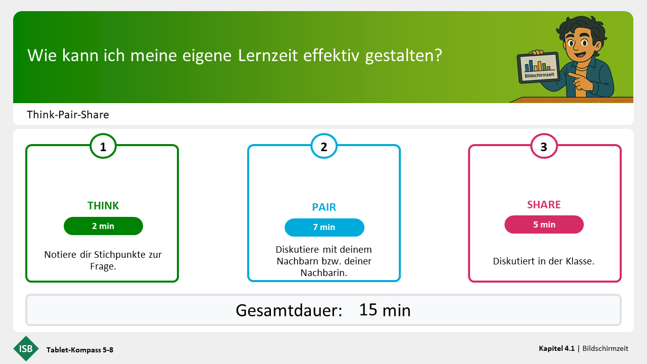 Leitfrage: “Wie kannst du deine eigene Lernzeit am Bildschirm effektiv gestalten? Notiere dir Stichpunkte und diskutiere anschließend, wie dir das gelingen kann.”