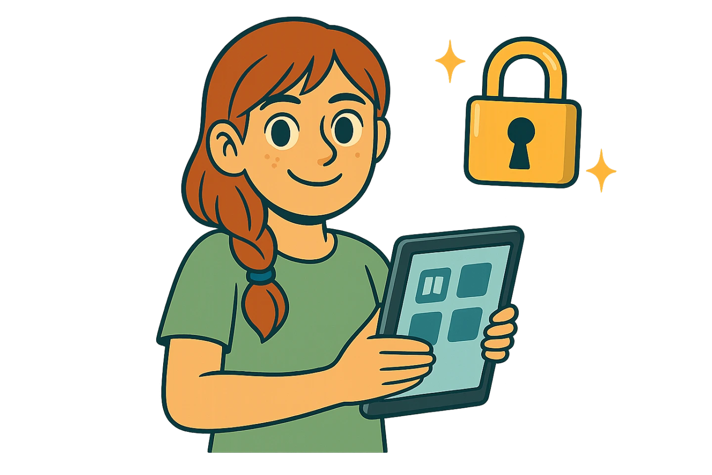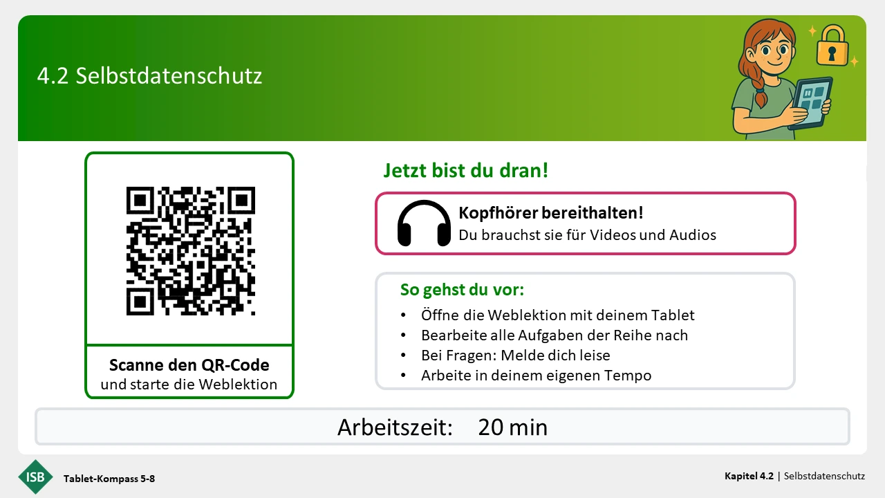 In diesem Kapitel setzen sich die Lernenden mit dem Schutz ihrer persönlichen Daten auf dem Tablet auseinander. Dabei geht es im Wesentlichen nicht um Datenschutzfragen im Bezug auf die Preisgabe im Internet sondern viel mehr im Klassenraum. Der Fokus liegt auf dem Schutz der Daten auf dem Gerät, die direkt auf dem Display eingesehen werden können.