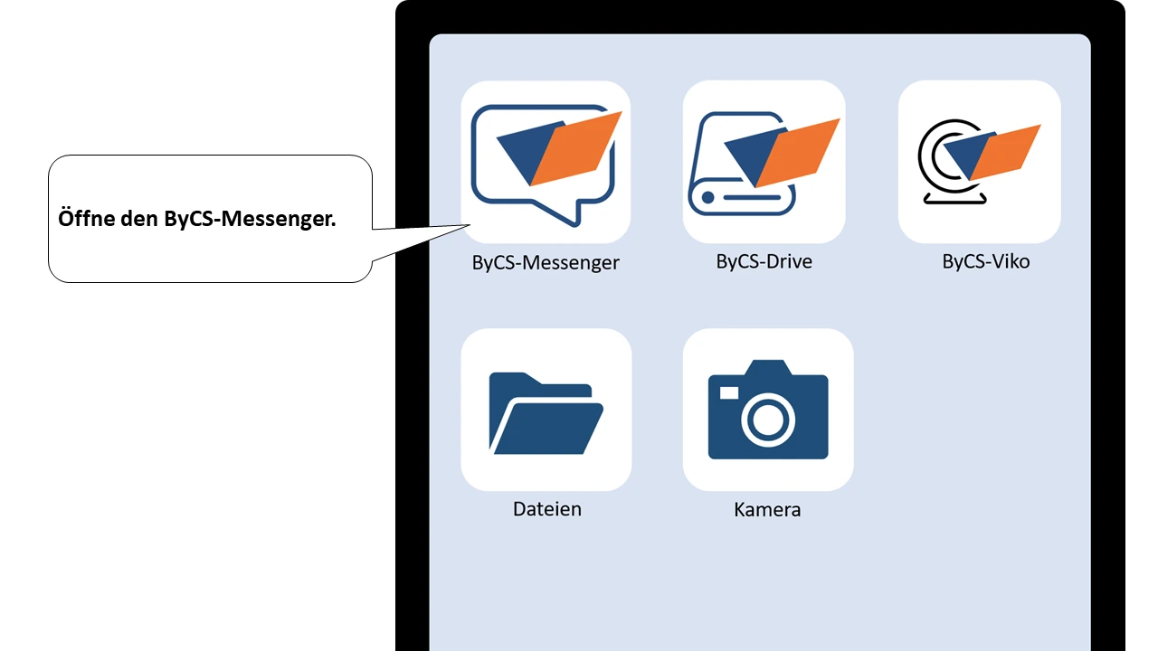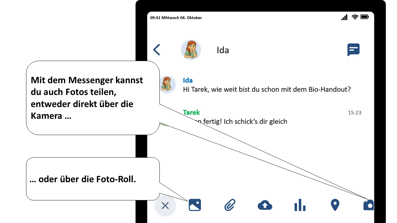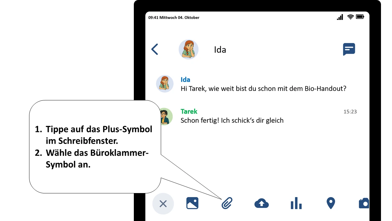 Ebenso kannst du Dateien über Messenger-Apps mit anderen teilen. Herr Mangstl empfiehlt Tarek und Ida, für alle Angelegenheiten rund um die Schule den BayernCloud Schule Messenger (= ByCS-Messenger) zu nutzen. Auch im ByCS-Messenger erfolgt das Teilen von Dateien über ein Büroklammer-Symbol.