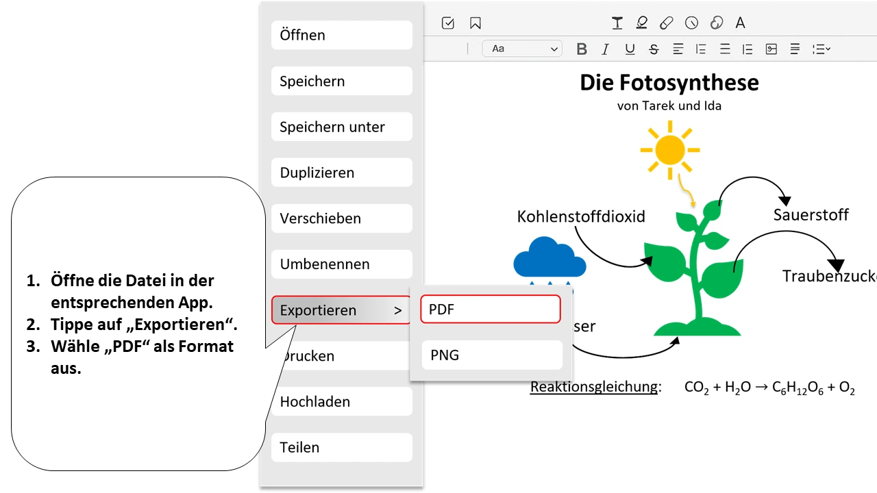 Auf dem Nachhauseweg unterhalten sich Ida und Tarek über die Tipps von Herrn Mangstl. „Herr Mangstl kennt sich ja richtig gut mit der Arbeit auf Tablets aus!“, meint Tarek. „Stimmt“, sagt Ida. „Und er kann es auch noch gut erklären. Dein Bild zur Fotosynthese ist dir übrigens echt gut gelungen und unser Handout für unser Referat schaut richtig gut aus, jetzt, wo du es mir als PDF zugeschickt hast. Ich habe es auch gleich in unserem gemeinsamen Ordner für Biologie gespeichert und beim Dateinamen noch das Datum ergänzt. So finden es unsere Klassenkameraden leichter.“