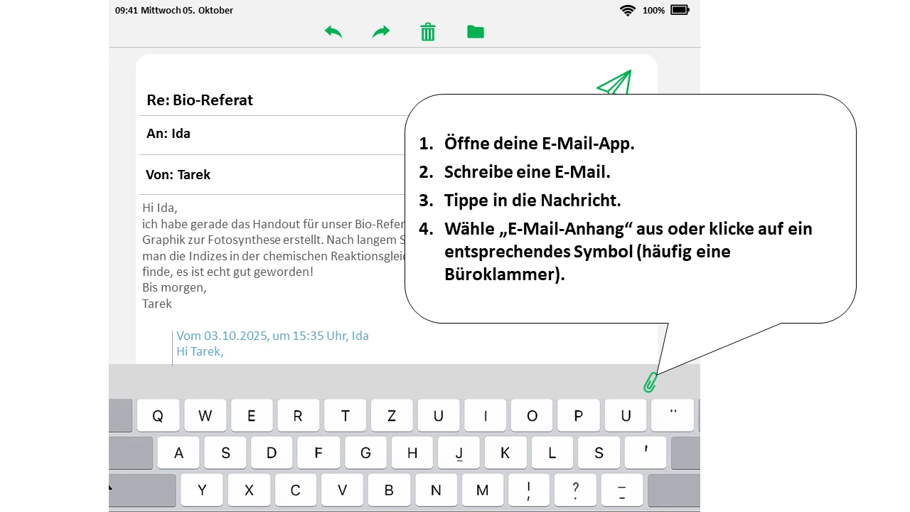 Tarek hat Ida seine Datei per E-Mail geschickt. Dazu hat er die Datei als Anhang eingefügt. Wie das geht, zeigen dir die beiden Bilder.