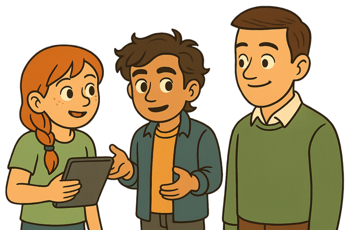 Da spricht ihr Lehrer Herr Mangstl die beiden an, der gerade über den Schulhof geht. „Was ist denn los, Tarek! Du schaust ja aus wie sieben Tage Regenwetter!“ Ida zeigt Herrn Mangstl auf ihrem Tablet das Handout mit den veränderten Formatierungen. Darauf antwortet er: „Das ist ein häufiges Problem, vor allem wenn man ein Text-Dokument wie eine Word-Datei in einem anderen Programm, wie z. B. der LibreOffice-App von Ida, öffnet. Deshalb rate ich meinen Schülern immer: Alle Abgaben am besten in eine PDF-Datei umwandeln und diese abgeben!“