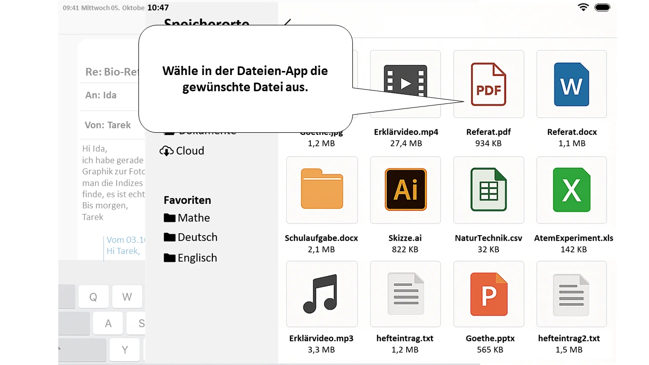 Bevor Herr Mangstl zurück in den Unterricht gegangen ist, hat er Ida und Tarek noch erklärt, dass man die Dateien auf dem Tablet am besten in der Dateien-App ansehen, bearbeiten oder teilen kann und es wirklich wichtig ist, dass alles übersichtlich und aufgeräumt ist. Wirf einen Blick in Tareks Dateien-App, um mehr über die Anzeige von Dateien in der Dateien-App zu erfahren. Ordne die Beschreibungen den passenden Sprechblasen zu.