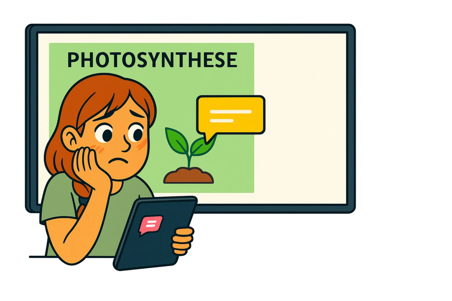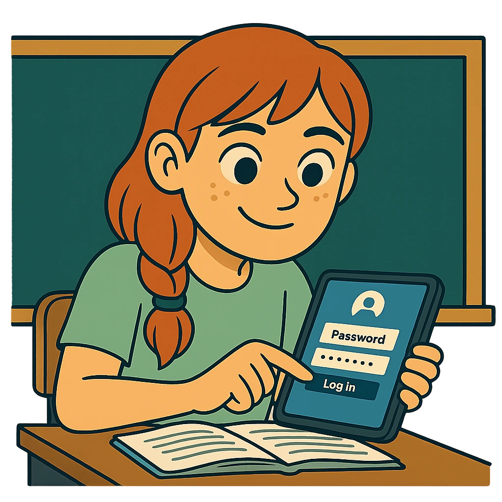Tarek, der neben ihr sitzt, flüstert: „Das ist mir auch schon mal passiert. Ich hatte sogar noch ein Spiel offen – richtig peinlich. Seitdem habe ich mir vorgenommen, besser auf mein Tablet aufzupassen. Und weißt du was? Du solltest dir auch gleich ein neues Hintergrundbild überlegen. Am besten etwas Neutrales, dann sieht auch da niemand Privates.“