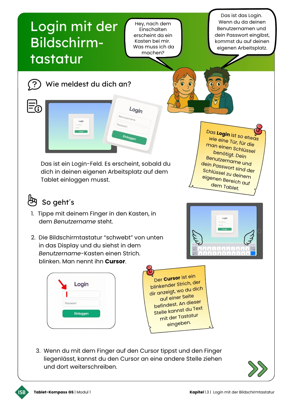 In diesem Kapitel erkunden die Schülerinnen und Schüler im Zusammenhang mit dem Login-Vorgang entdeckend die Bildschirmtastatur des Tablets. Sie lernen das Login-Feld sowie die Verwendung des Cursors kennen. In praktischen Übungen erproben sie Buchstaben-, Zahlen- und Sonderzeichentasten und lernen die vier zentralen Funktionstasten – Umschalt-, Lösch-, Leer- und Eingabetaste – in ihrer Funktion und Position auf der Bildschirmtastatur kennen. So entwickeln die Lernenden ein erstes Verständnis für den Aufbau und die grundlegende Funktionsweise der Bildschirmtastatur.