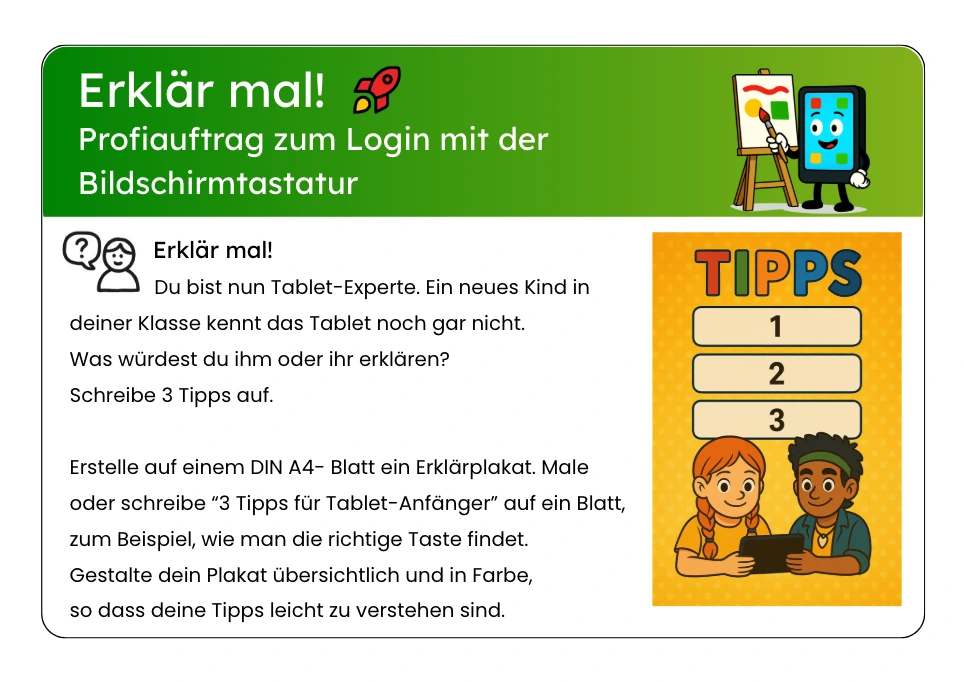 Daraufhin erklärt die Lehrkraft: „Heute üben wir, wie man sich mit der Bildschirmtastatur anmeldet. Wir schauen uns genau an, wie die Tasten aussehen, wie man Buchstaben und Zahlen findet und wie man sein Passwort richtig eingibt.“