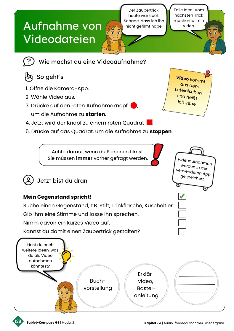 Zum Einstieg empfiehlt es sich, ein Beispiel vorzuspielen – etwa ein kurzes Video mit Kommentar oder eine einfache Sprachaufnahme. Daraus ergeben sich Gesprächsimpulse wie: „Habt ihr schon mal ein Video oder eure Stimme aufgenommen?“ – „Was muss man dabei beachten?“ Gemeinsam wird erarbeitet, dass Audio- oder Videoformate sich gut eignen, um Lernprozesse, Erklärungen oder Ergebnisse festzuhalten.