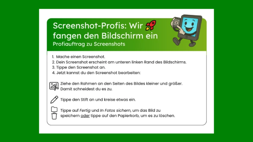 Zum Abschluss können die gespeicherten Screenshots gemeinsam überprüft werden und in einer Anschlussaufgabe, etwa in einem Dokument oder in einer Präsentation, weiterverwendet werden.