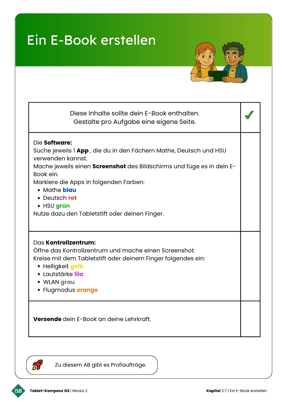 Das E-Book kann sowohl in Einzel- als auch in Partnerarbeit gestaltet werden. Die Form der Partnerarbeit wird hier besonders empfohlen, da die Kinder sich gegenseitig unterstützen können. Vor allem unsichere Kinder erfahren durch andere Kinder eine mögliche Unterstützung.