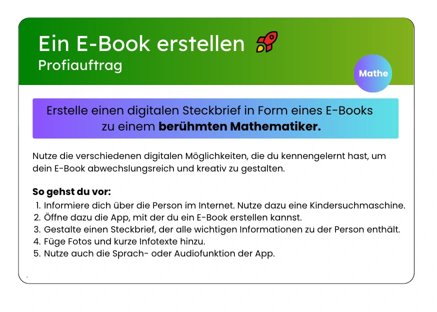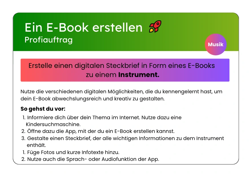 Um den Umgang mit den Funktionalitäten der App einzuüben, kann den Lernenden auch zunächst der Arbeitsauftrag gegeben werden, ein E-Book zu einem Fachthema aus dem aktuellen Unterricht zu erstellen.