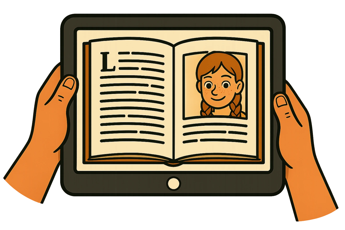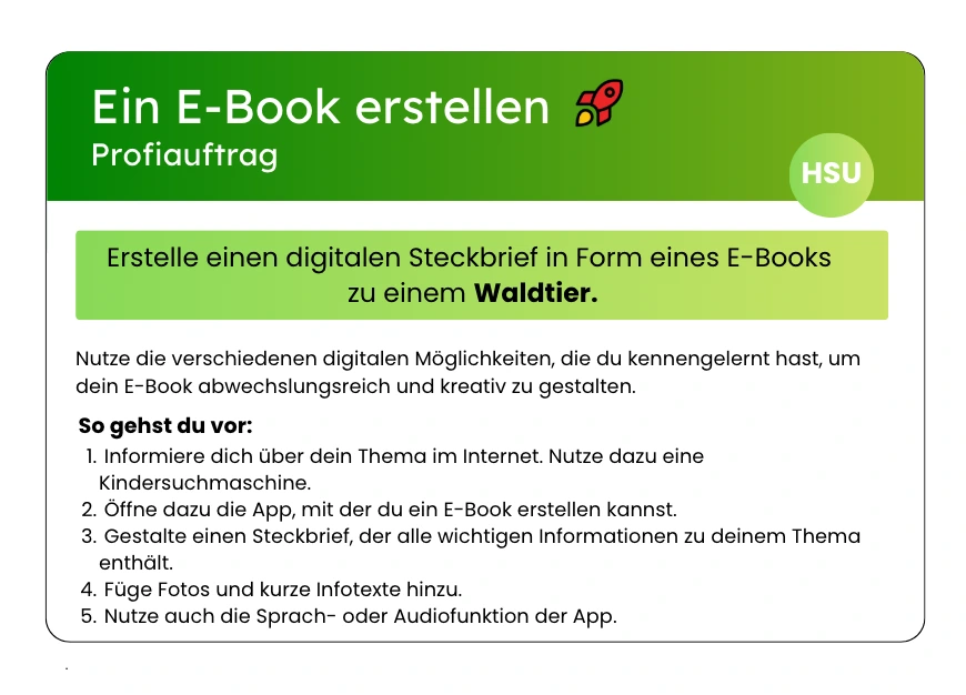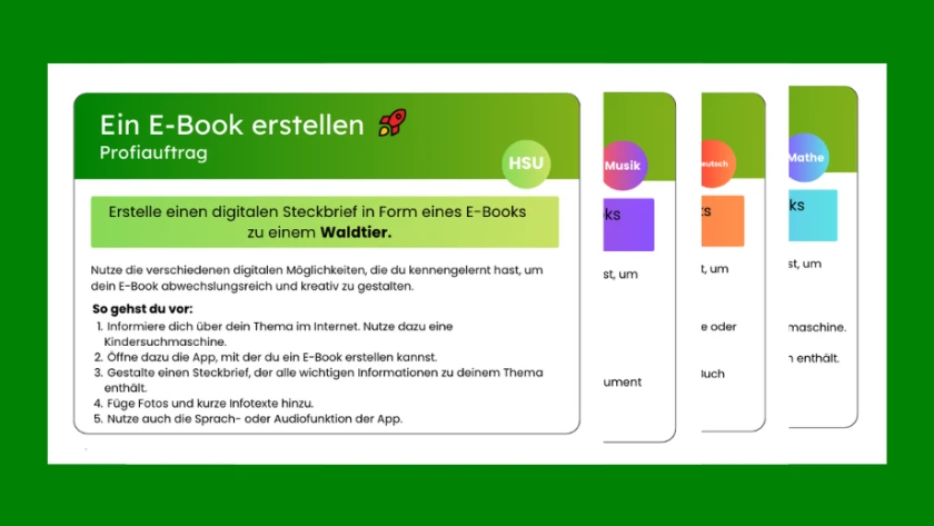 Die Lehrkraft zeigt den Schülerinnen und Schülern zu Beginn der Unterrichtsstunde ein Tablet, auf dem ein bunt gestaltetes E-Book mit Bildern und kurzen Texten geöffnet ist – zum Beispiel eine kleine Bildergeschichte oder ein Tierlexikon (günstig wäre hier, wenn möglich, das Spiegeln des Lehrer-Tablets an die Tafel). Gemeinsam wird durch das e-Book geblättert, und die Kinder dürfen raten, wie dieses Buch wohl entstanden ist.
