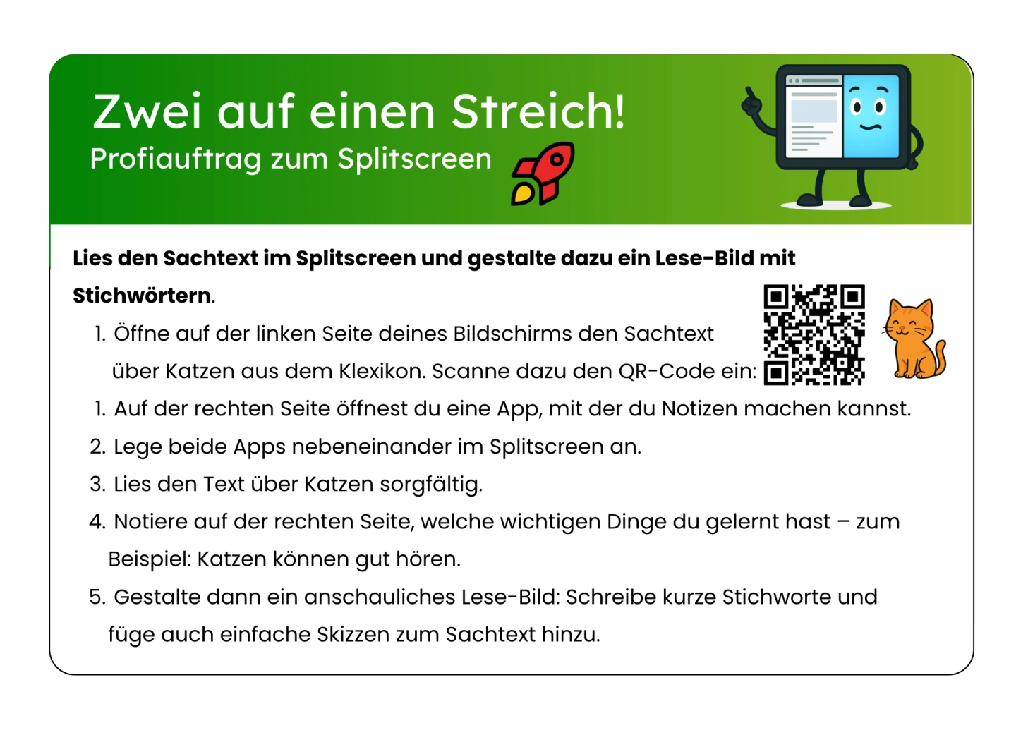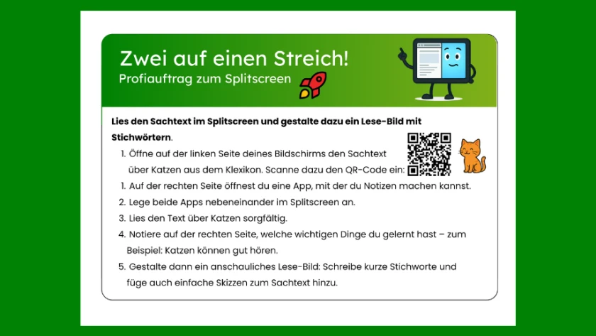 Darauf aufbauend bearbeiten die Schülerinnen und Schüler die Mitmachheftseite und probieren den Splitscreen selbst aus.