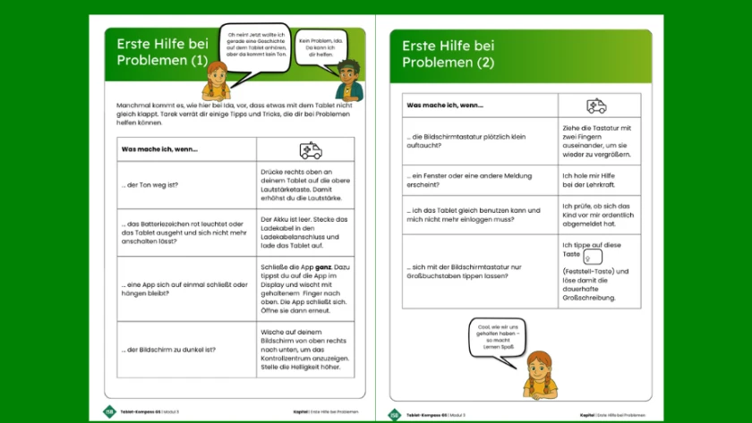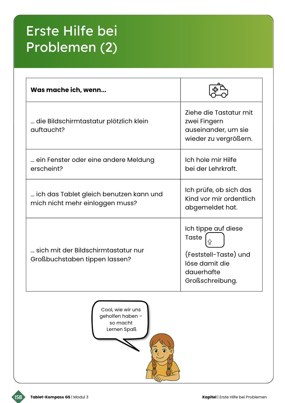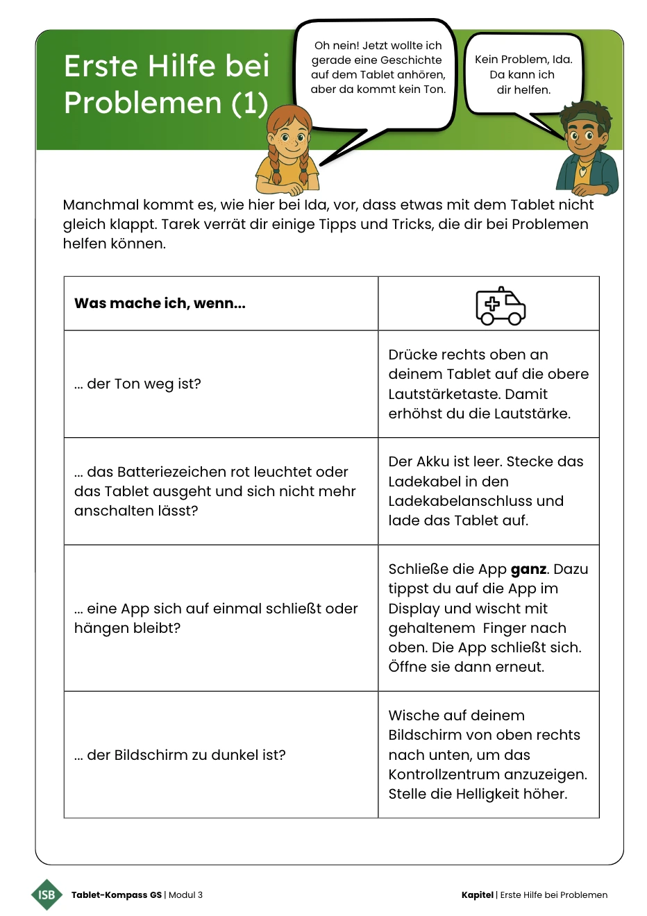Erste Hilfe bei Problemen kann ähnlich wie Mein Tablet-Wissen zu Beginn von Modul 1 in mehrfacher Ausfertigung als Nachschlagemöglichkeit, auch gemeinsam mit den Seiten von Mein Tablet-Wissen (in einem Geheft), im Klassenzimmer für die Lernenden ausgelegt werden.