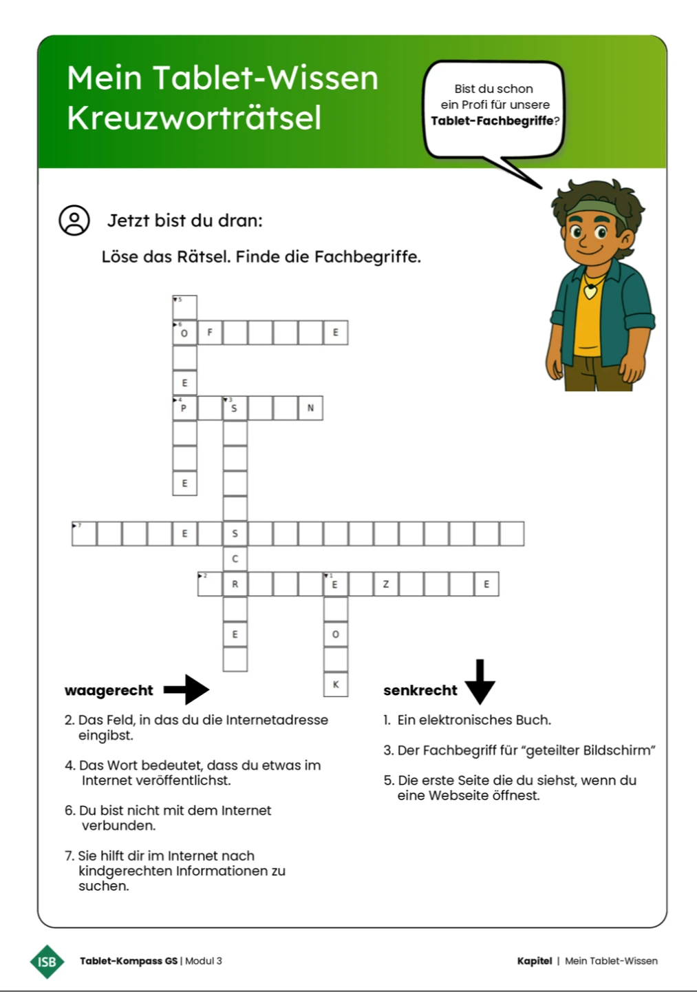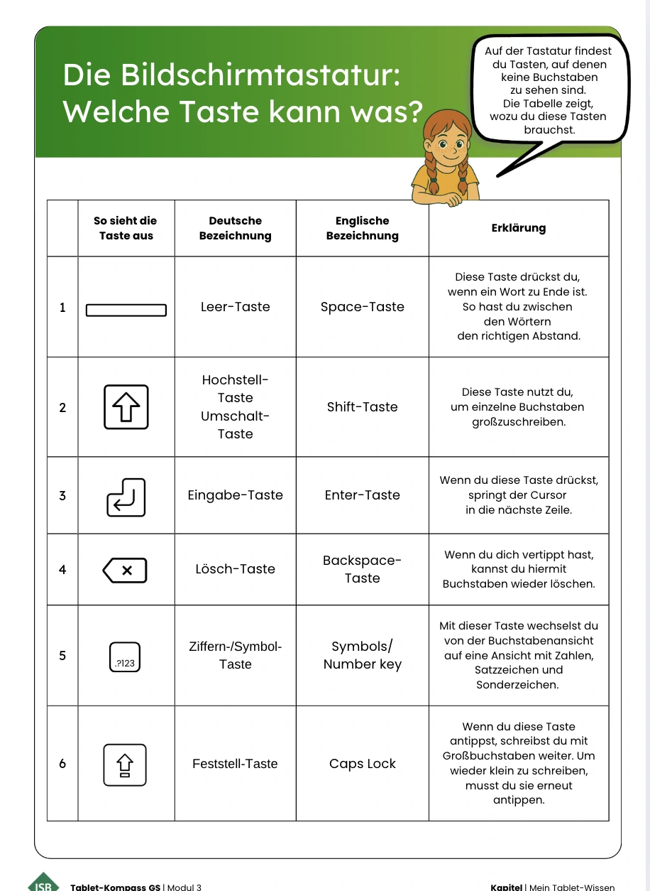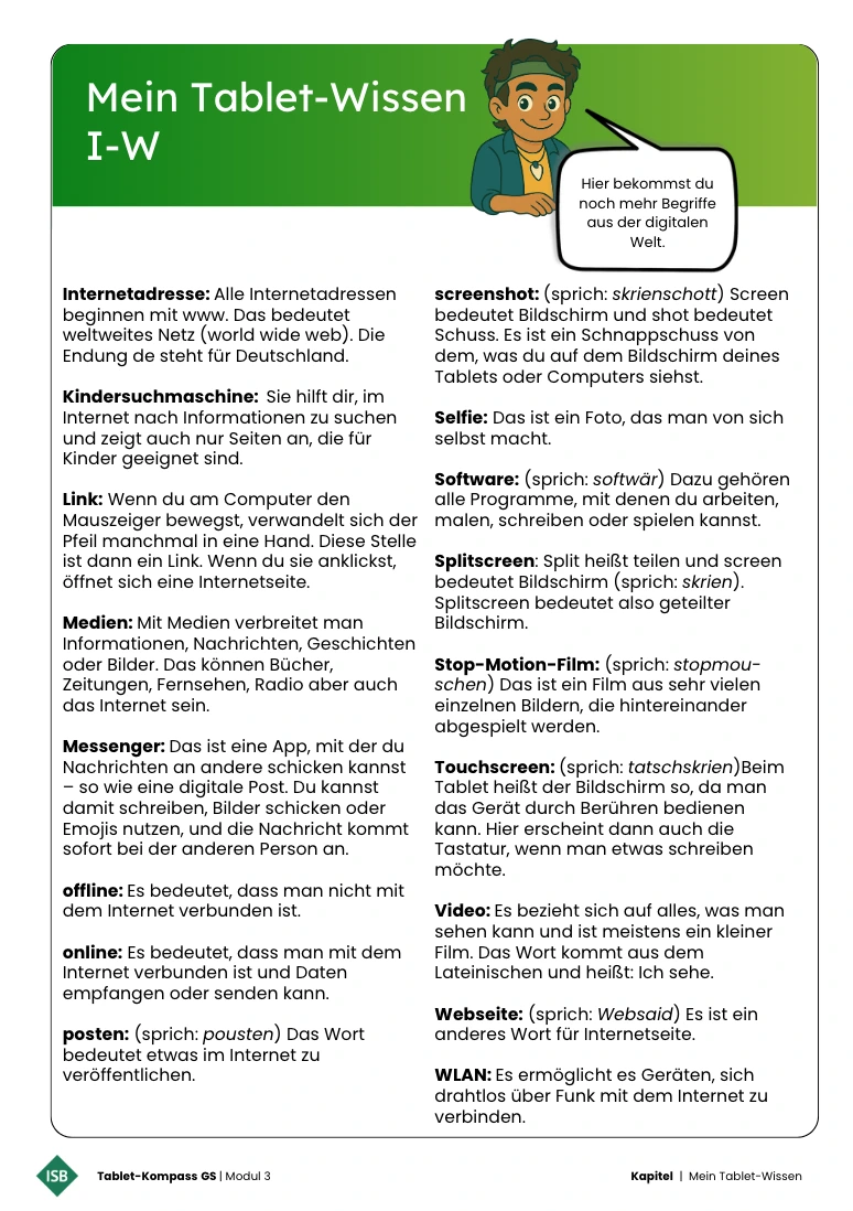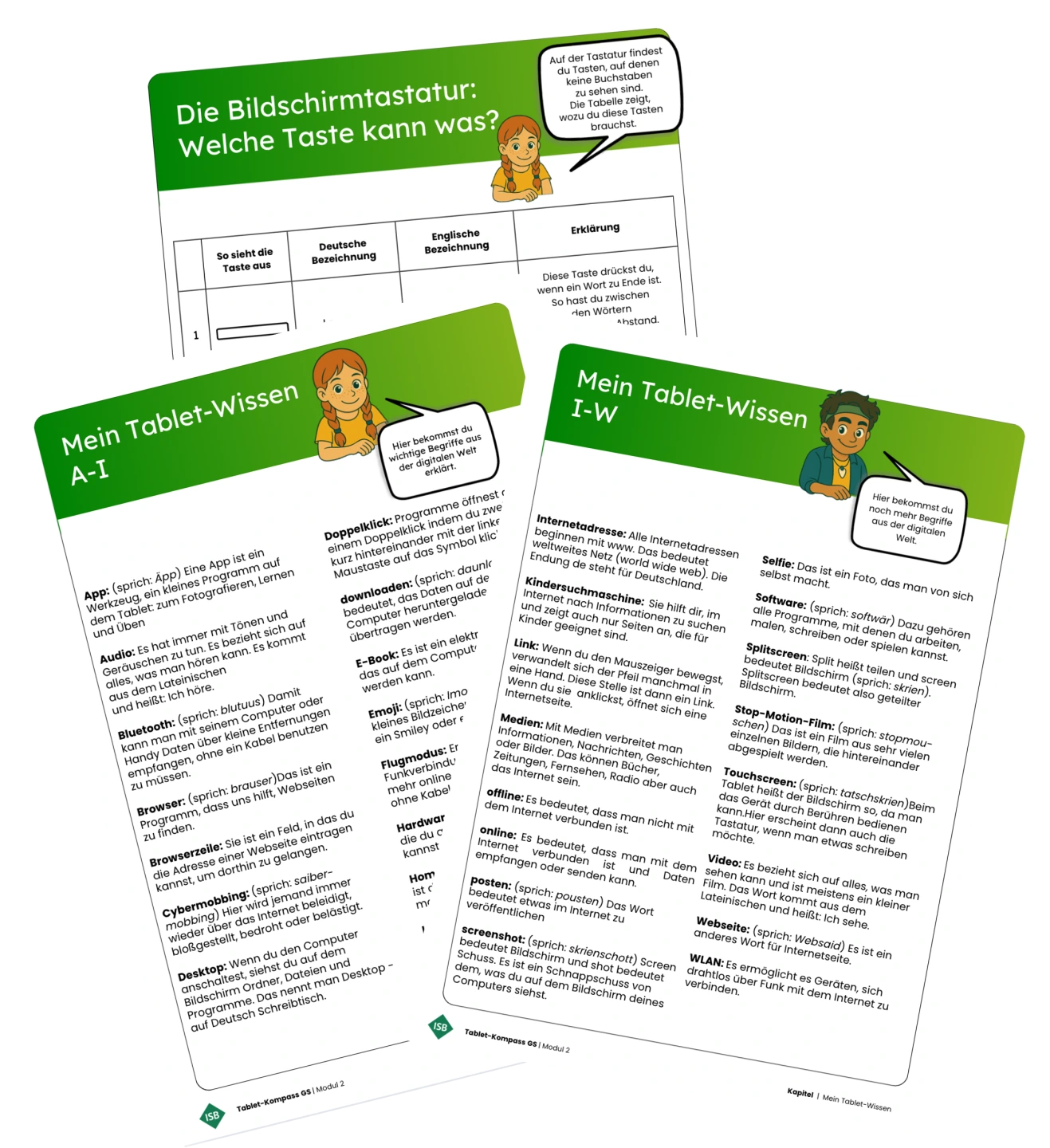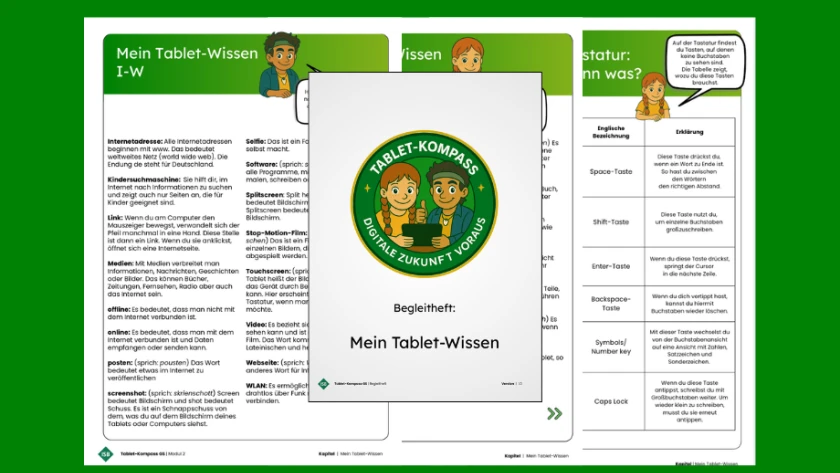 Die Seiten zu Mein Tablet-Wissen dienen als eine Art Lexikon, das ausgewählte Begriffe der digitalen Welt erklärt. Bei der Durchführung des Tablet-Kompasses stoßen die Schüler und Schülerinnen immer wieder auf solche Fachbegriffe. Das Mein Tablet-Wissen soll den Kindern von Anfang an als alphabetisches Nachschlagewerk dienen, diese Begriffe zu verstehen und zu verinnerlichen. Ergänzt werden die Seiten von Mein Tablet-Wissen durch eine Tabelle zur Bildschirmtastatur, in der die Lernenden die Bezeichnung und die Funktionalität einiger wichtiger Tasten nachschauen können.