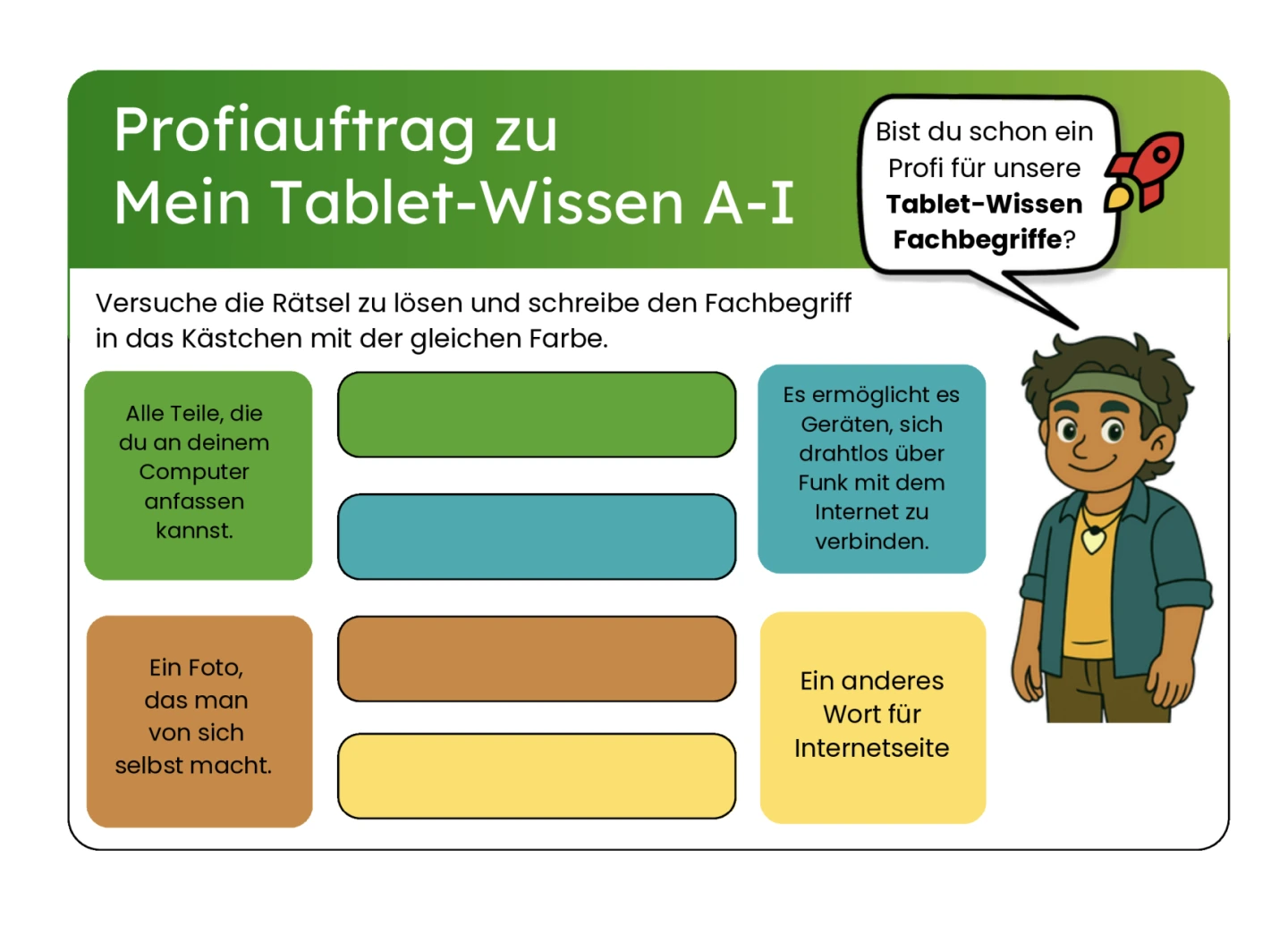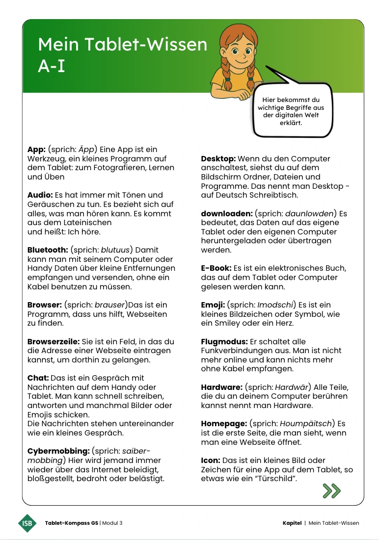Ein kompetenter Umgang mit Informationen in Hinblick auf deren Beschaffung oder Verarbeitung erfordert die Kenntnis vieler Fachbegriffe. Die Seiten zu Mein Tablet-Wissen dienen deshalb als ein alphabetisches Nachschlagewerk, dass den Schülerinnen und Schülern jederzeit zur Verfügung stehen sollte. Dadurch wird gewährleistet, dass sie ihnen fremde Begriffe im Zusammenhang mit digitalen Medien verstehen und verinnerlichen.