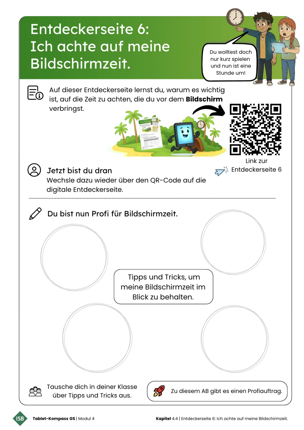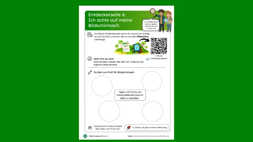 Über den QR-Code auf der Mitmachheftseite, gelangen Ihre Schülerinnen und Schüler zu den einzelnen Aufgaben und Inhalten der Entdeckerseite 6 und setzen sich individuell mit dem Thema “Ich achte auf meine Bildschirmzeit.” auseinander.