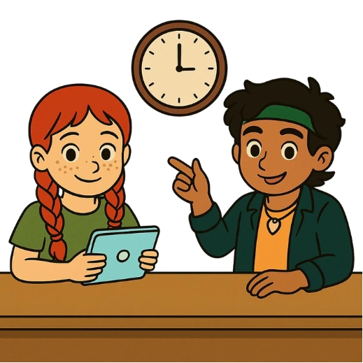 Der Einstieg in das Thema gelingt mit einem Gesprächsanlass. Ein Bild zeigt einen Jungen, der vertieft am Tablet sitzt und dabei völlig die Zeit vergisst. Dieser Bildimpuls führt die Kinder gezielt an das Thema Bildschirmzeit heran. Im Gespräch berichten sie von eigenen Erfahrungen und erkennen, wie leicht man beim Spielen oder Arbeiten am Bildschirm das Gefühl für die Zeit verlieren. Als Beispielbild bieten wir hier eine Darstellung von Tarek an.
