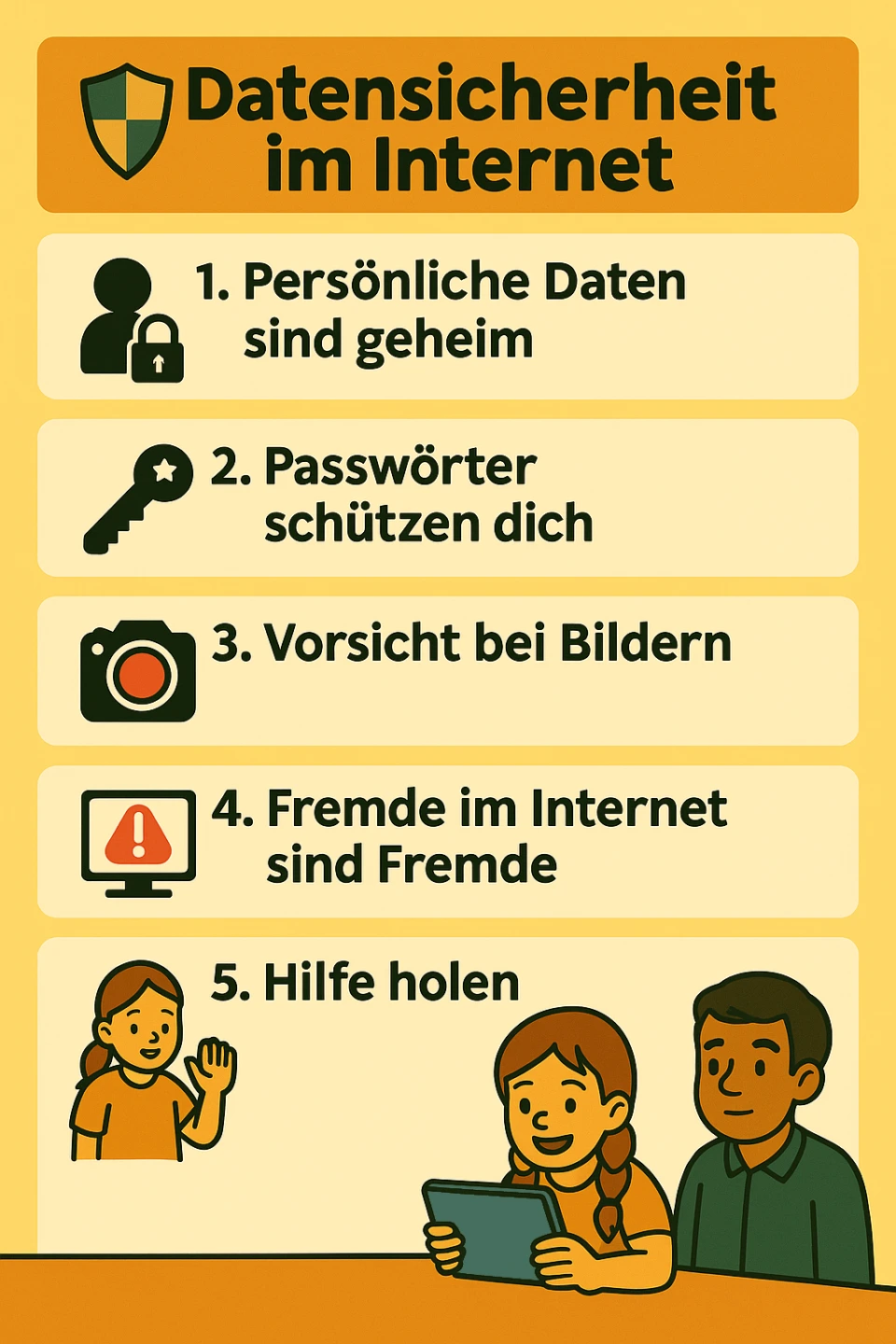 Darum ist es wichtig, diese Daten gut zu schützen – so wie einen Schatz – und sie nur Menschen zu geben, denen du wirklich vertrauen kannst, zum Beispiel deiner Familie oder deiner Lehrkraft.