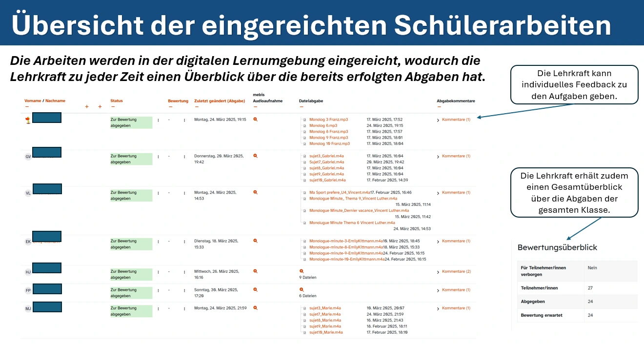 Die Arbeiten werden in der digitalen Lernumgebung eingereicht, wodurch die Lehrkraft zu jeder Zeit einen Überblick über die bereits erfolgten Abgaben hat.