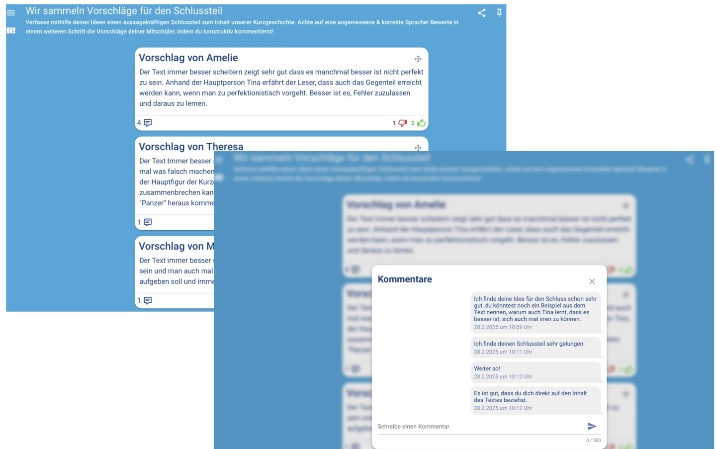 durch kollaborative Werkzeuge den direkten Austausch zwischen den Lernenden in Form von gegenseitigen Kommentaren und Bewertungen.
