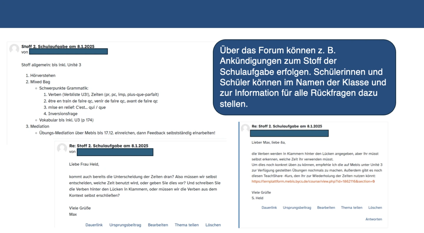 Kommunikationswerkzeuge eröffnen den Lernenden neue Möglichkeiten, auch außerhalb des Unterrichts Fragen zu stellen und gegebenenfalls konkrete Arbeitsstände einzureichen. Die Beantwortung dieser Fragen kann sowohl durch die Lehrkraft als auch im Austausch mit Mitschülerinnen und Mitschülern erfolgen. Dabei sind die Formate für Rückmeldungen vielfältig und können beispielsweise Sprachnachrichten oder schriftliche Kommentare, Anmerkungen oder Verbesserungen direkt in den Arbeitsständen umfassen. Um jedoch der Erwartung einer ständigen Verfügbarkeit vorzubeugen, sollten eindeutige Absprachen zur Erreichbarkeit von Lehrkräften und Lernenden getroffen werden.