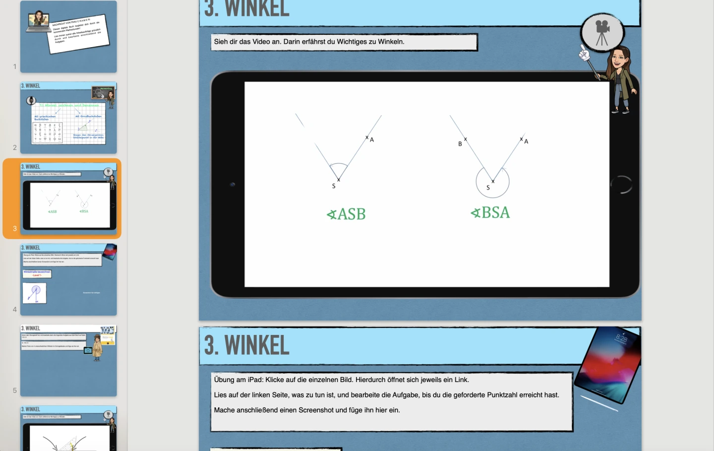 Die Lernumgebung kann wie hier am Beispiel Winkel mit Hilfe einer Präsentationssoftware gestaltet werden. Durch die Seitenansicht erhalten die Lernenden einen Überblick über ihren Lernfortschritt innerhalb des Lernpfades. -