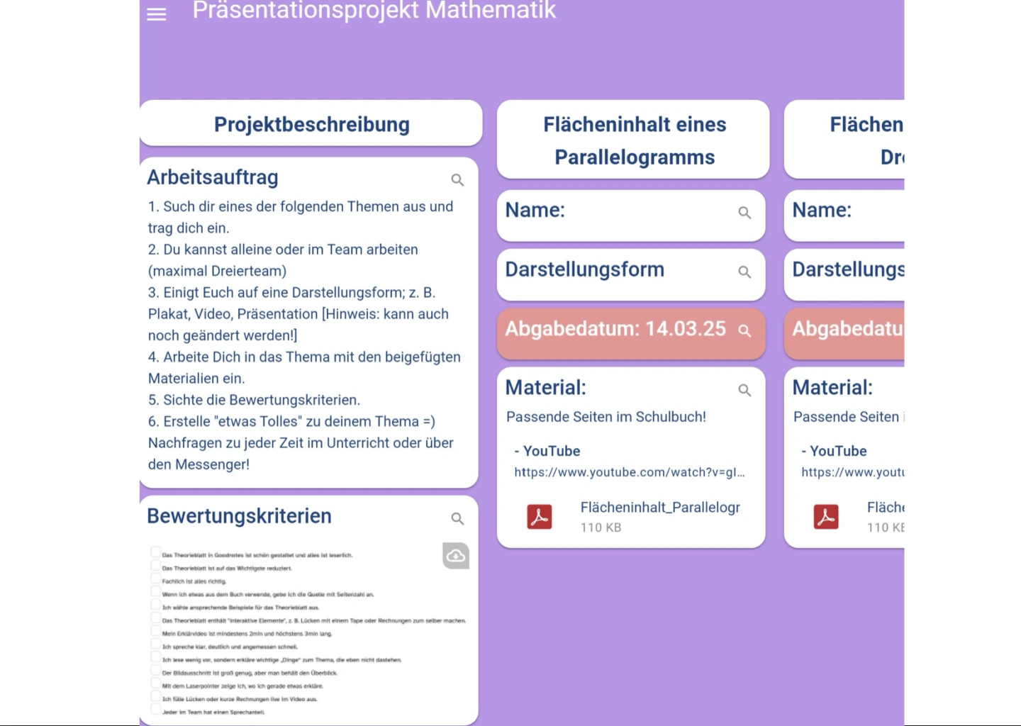 Alle notwendigen Informationen zum Projekt sind gesammelt auf der Pinnwand zu finden. Eines der zur Verfügung gestellten Themen muss bearbeitet werden, wobei die Wahl des zu erstellenden Lernproduktes, z. B. Erklärvideo, Plakat, Präsentation sowie die Sozialform frei sind. -