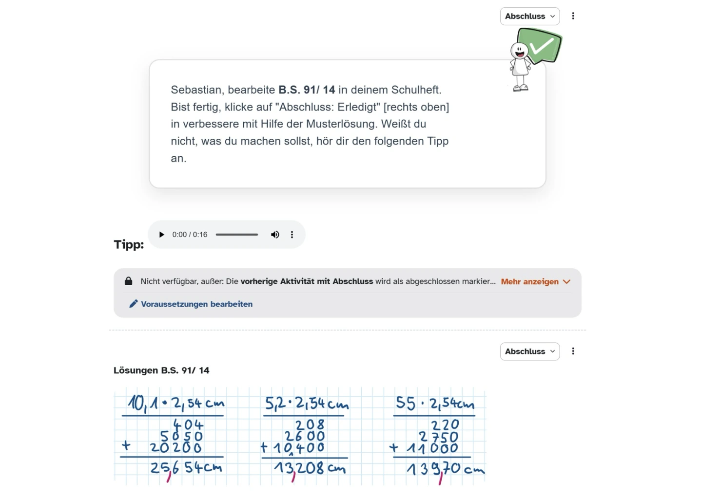 Der Arbeitsauftrag für Übungen aus dem Schulbuch in Mathematik wird in der mebis Lernplattform personalisiert gestellt. Der Tipp als Audiodatei ist optional. Die Lösung wird erst freigeschaltet, wenn aktiv auf „Erledigt“ geklickt wird. Die Verbesserung erfolgt anhand ausführlicher Lösungen selbstständig. Die Lernenden werden in dieser Phase des Unterrichts intensiv von der Lehrkraft als Lerncoach begleitet. Gegenseitige Hilfen und Austausch im Klassenzimmer ist sehr erwünscht. -