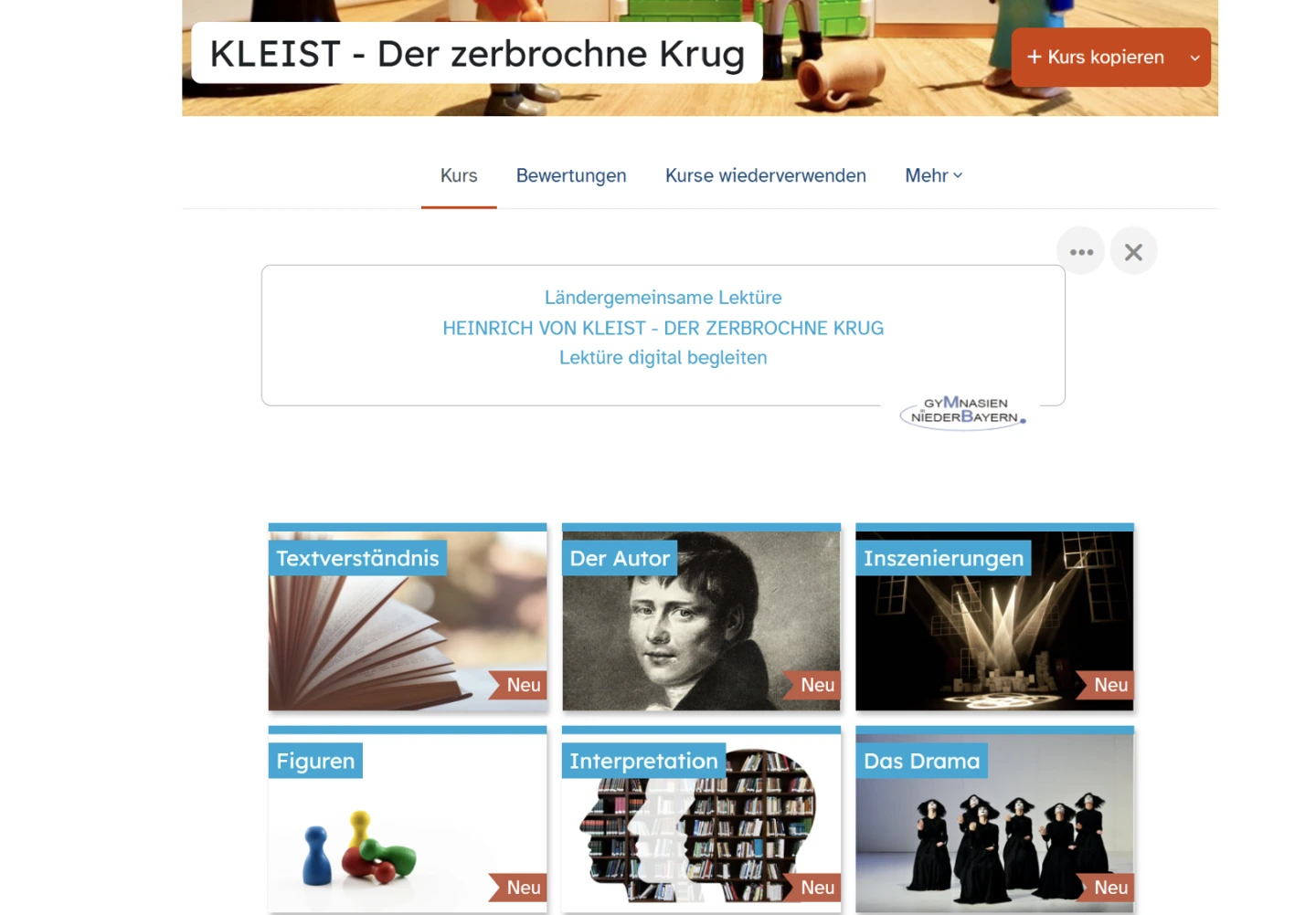 Alle Materialien zur Bearbeitung der Deutschlektüre „Der zerbrochene Krug von Kleist“ sind strukturiert in einem Kurs der mebis Lernplattform (teachSHARE) zu finden. Der Kurs enthält verschiedenste Aktivitäten, um die jeweiligen Lernziele zu erreichen. -