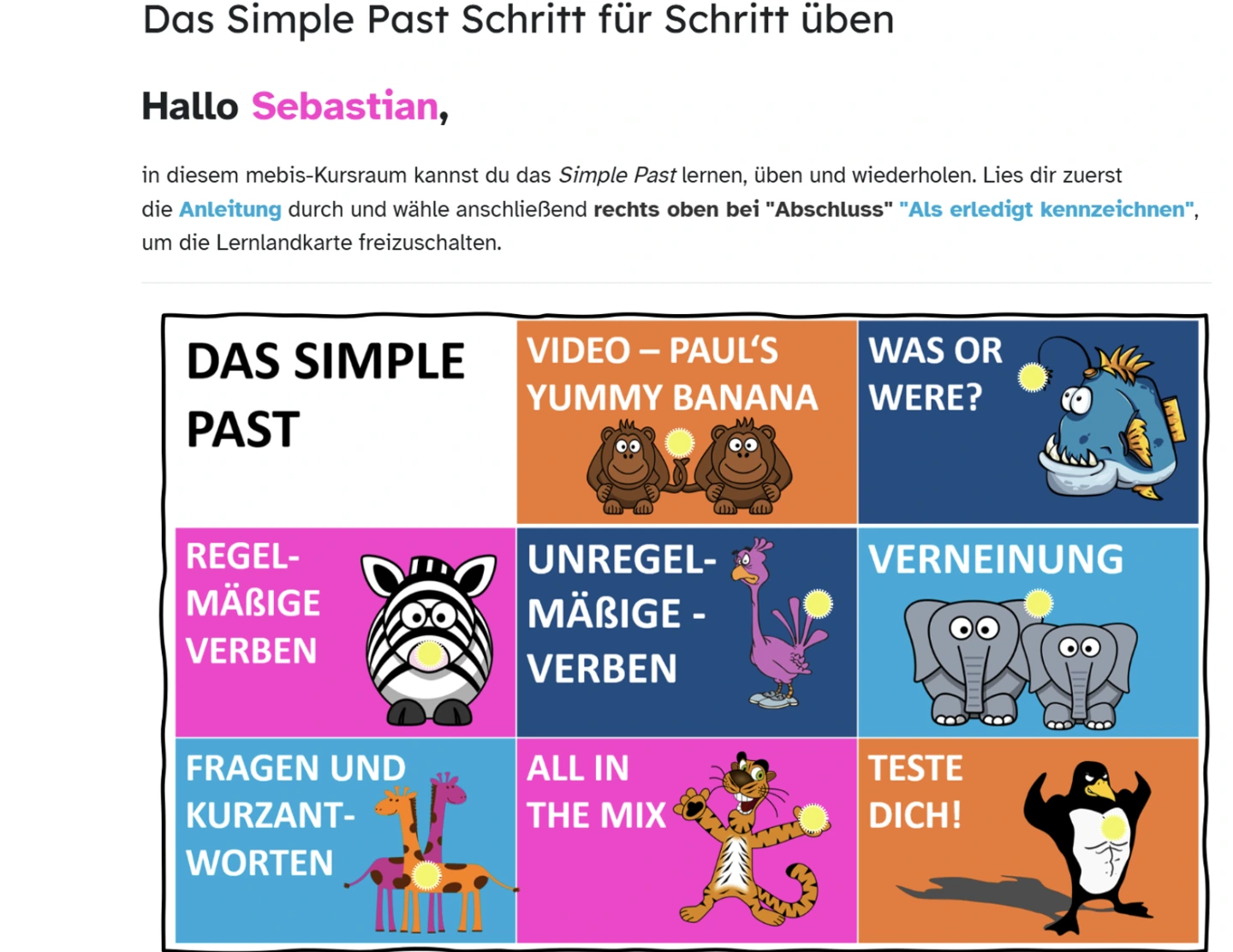 In der mebis Lernplattform (teachSHARE) kann das Simple Past in Englisch sehr eigenständig erlernt werden. Die Navigation über eine Lernlandkarte ist optisch sehr ansprechend und einfach. Die interaktiven Erklärungen und Übungen sind immer am Lernziel orientiert. -