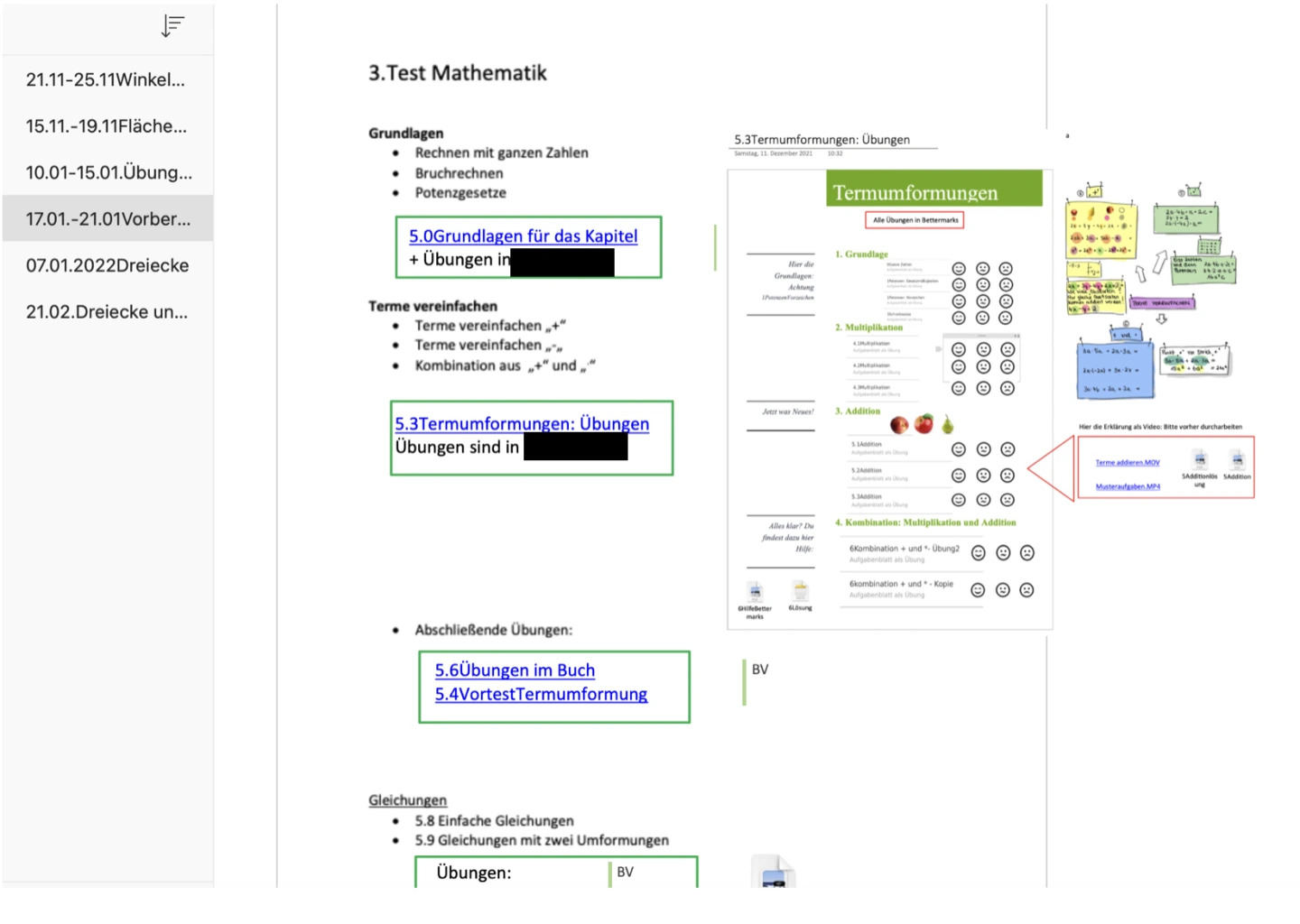 Zur Schulaufgabenvorbereitung der Themen "Terme und Gleichungen" werden den Lernenden Zusammenfassungen, Übungen und Selbsteinschätzungsangebote über eine geteilte Notizen-Software zur Verfügung gestellt. -