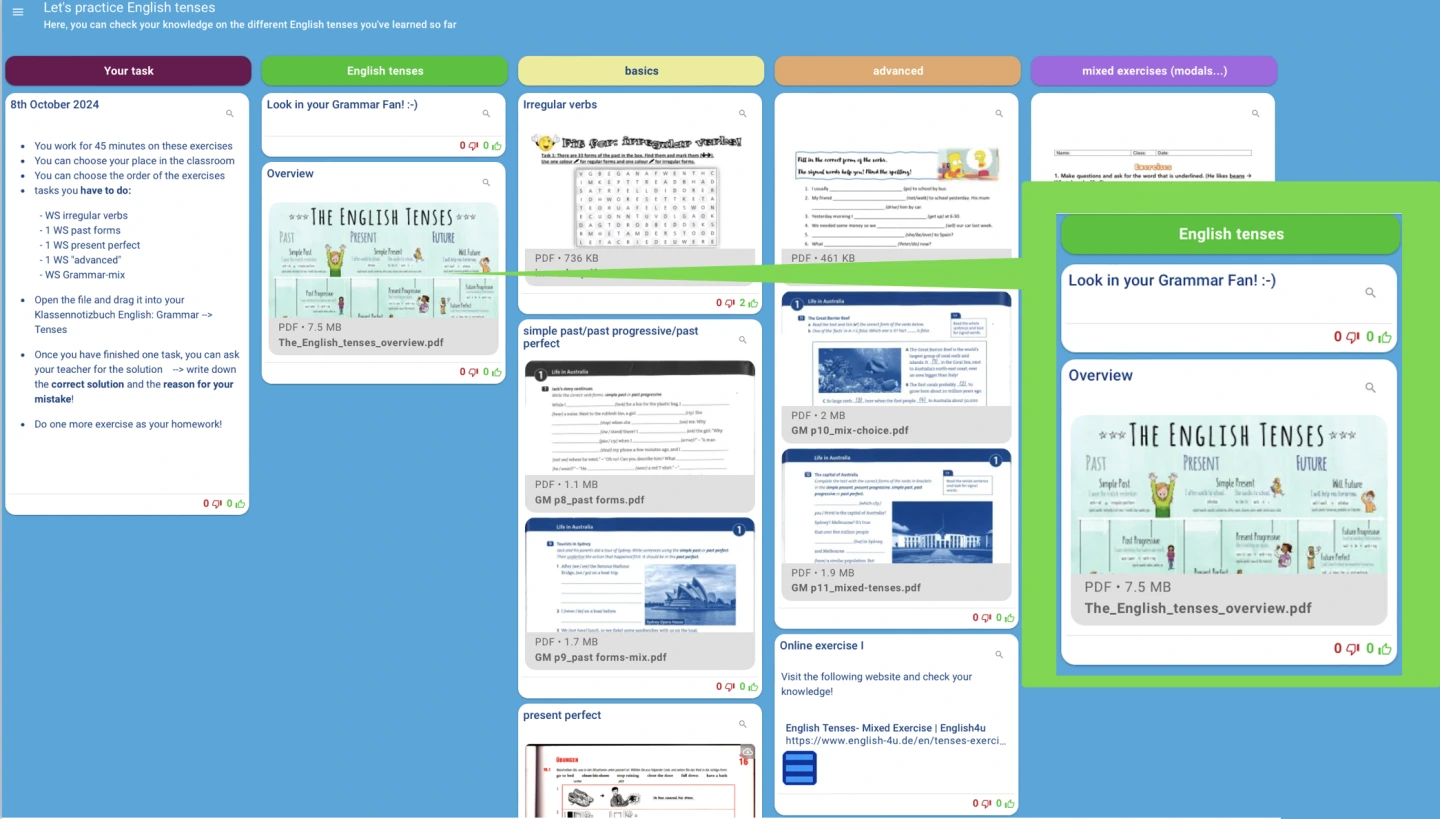 Mit Hilfe der Inhalte auf der digitalen Pinnwand können die Lernenden ihr Wissen über "English tenses" überprüfen und verbessern. -
