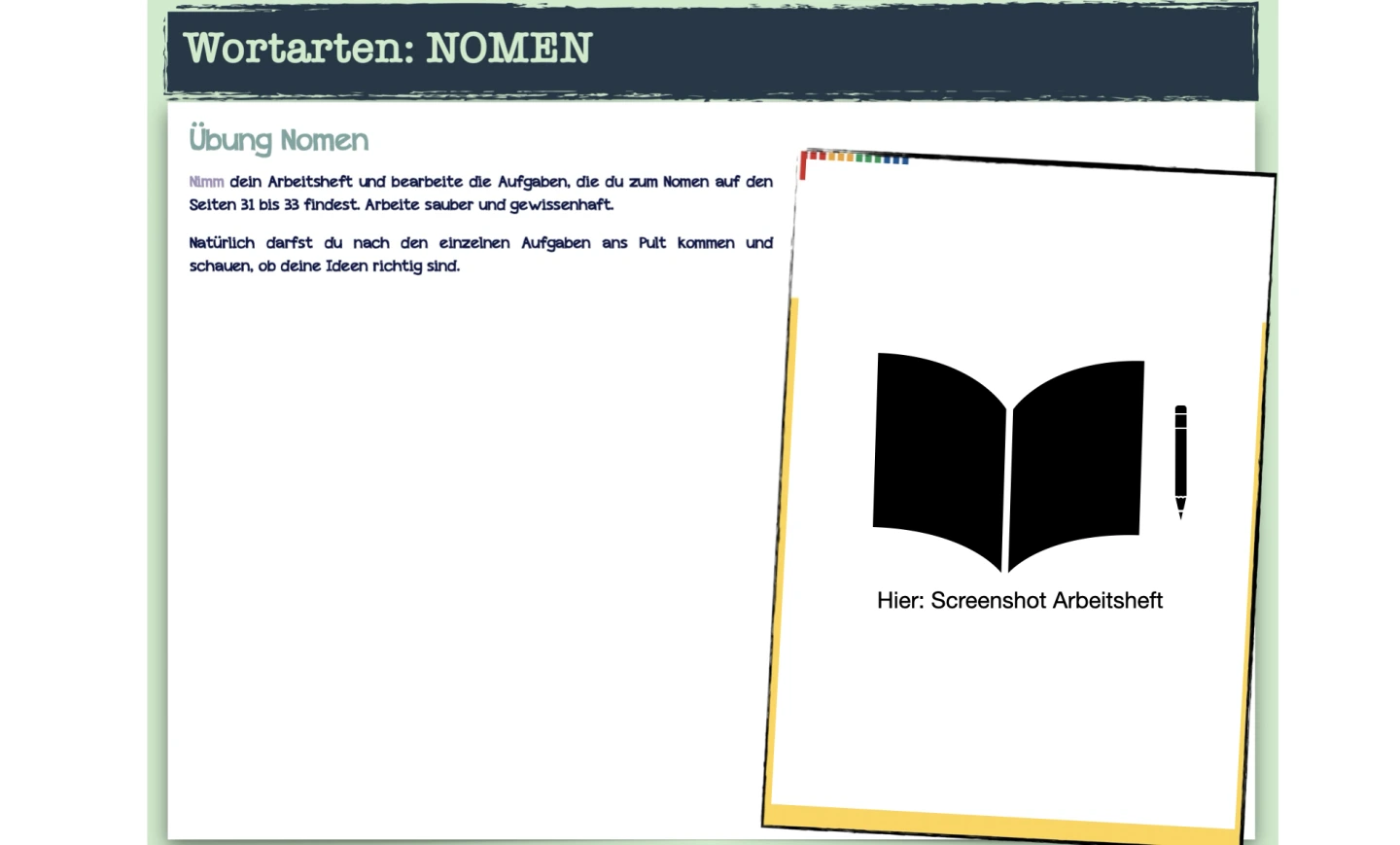 Analoger Übungsmaterialien wie z. B. ein analoges Arbeitsheft wird in die multimediale Lernumgebung integriert und erweitert die Möglichkeiten zur Übung. -