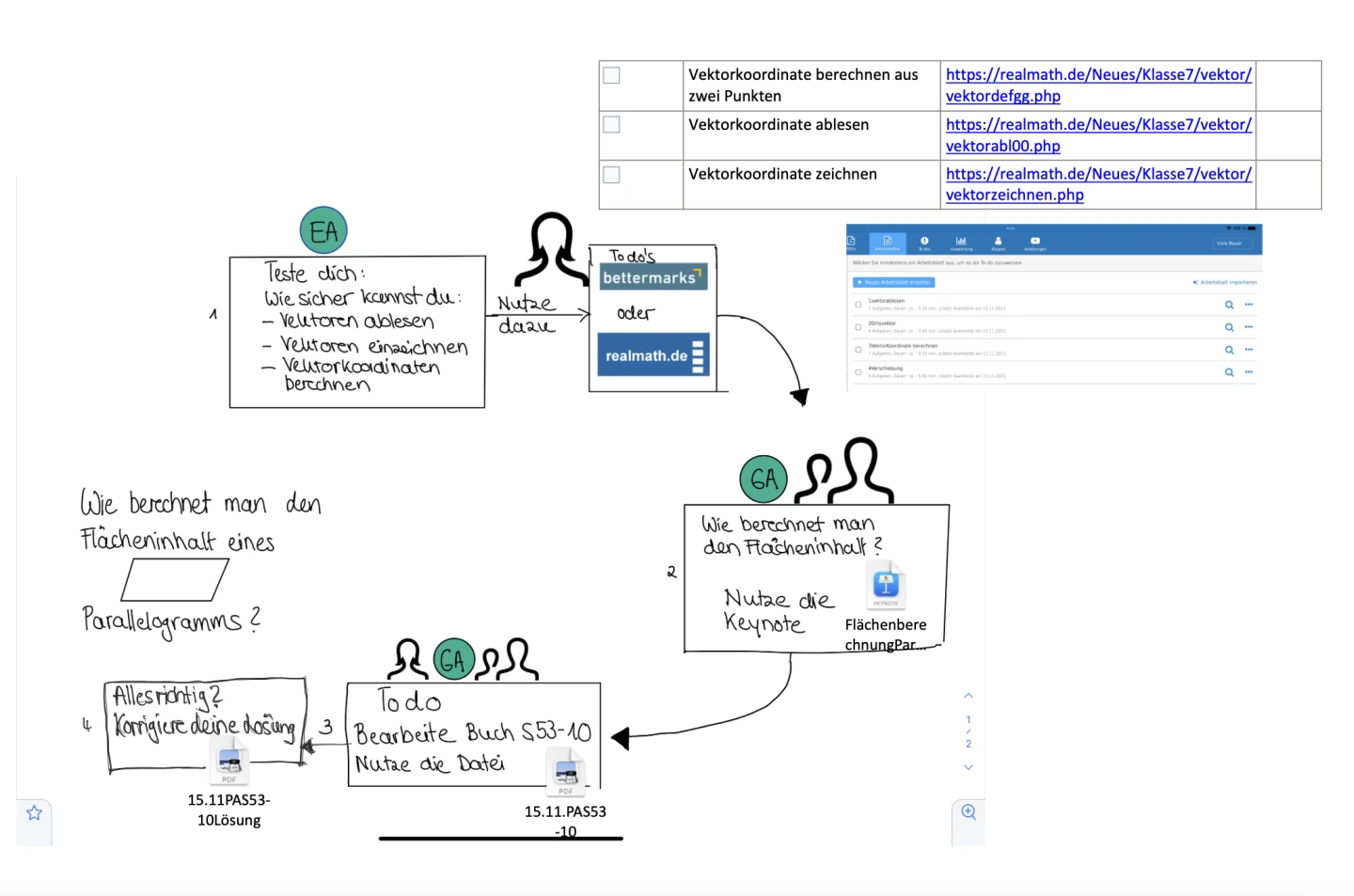 Über Links zur Lernplattform wird ein individualisiertes Lernen mit Aufgaben ermöglicht, die automatisiert Feedback geben. Die Sicherung im Lernpfad erfolgt über einen Screenshot. -