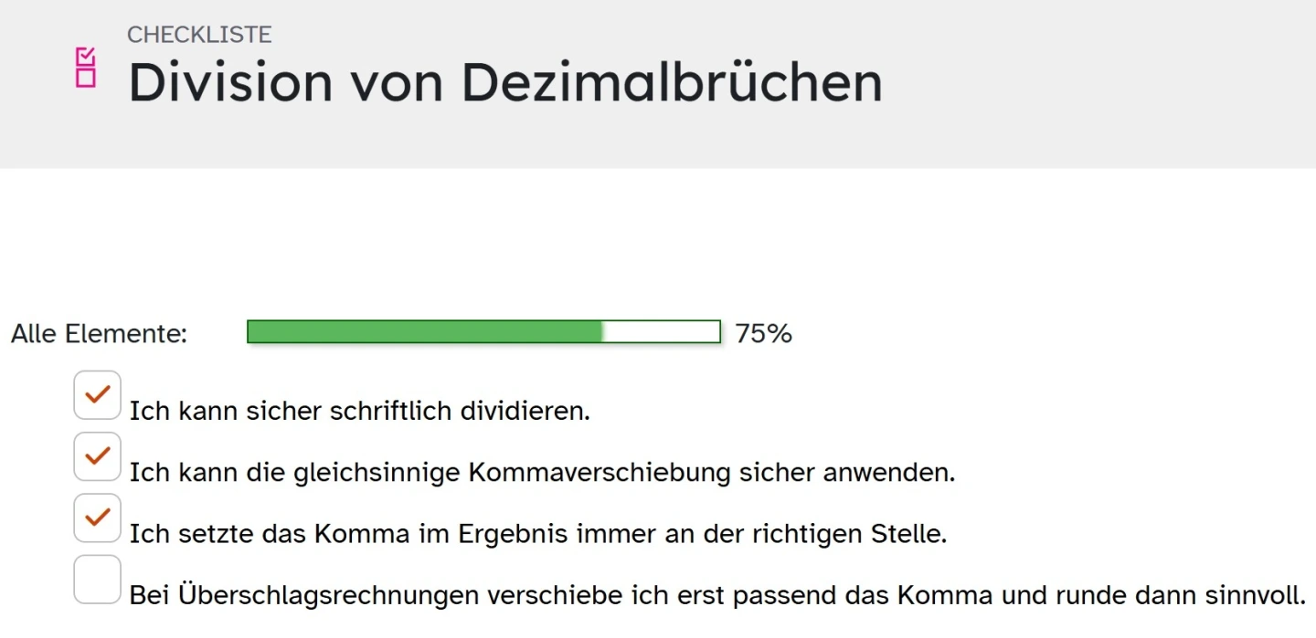 Durch Zwischentest und einem Feedback durch die Lehrkraft erhält der Lernende Rückmeldung über seinen Lernerfolg und kann anschließend in der Lernumgebung weitergearbeitet oder Inhalte noch einmal wiederholen werden.