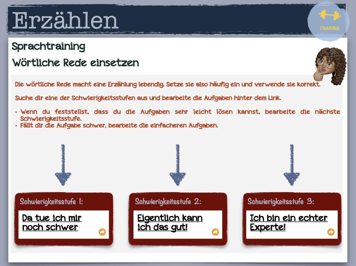 Die Lernenden können je nach Kompetenzniveau auswählen, welchen Schwierigkeitsgrad sie bearbeiten möchten. -