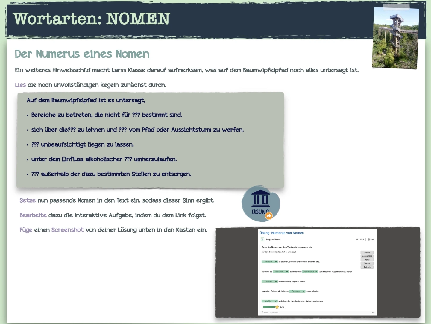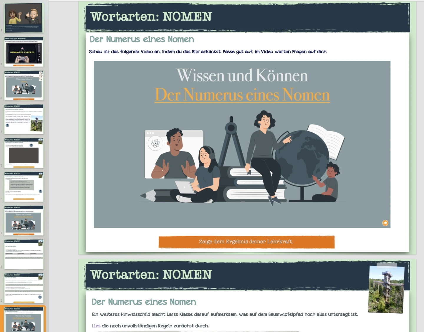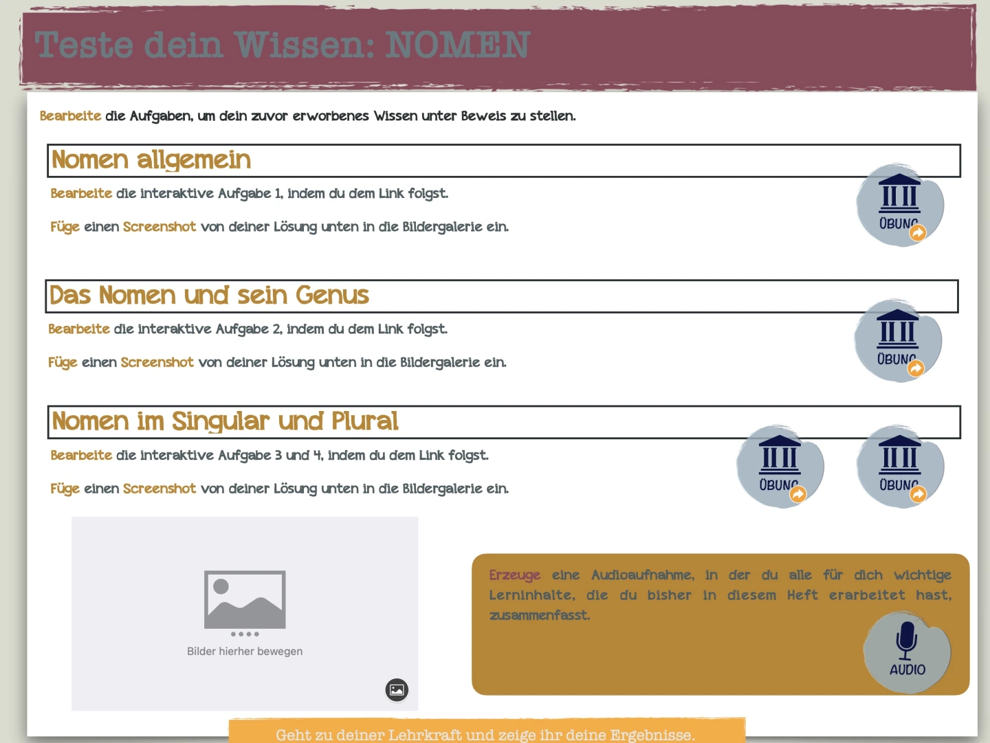 Die Lernumgebung kann wie hier am Beispiel Nomen mit Hilfe einer Textverarbeitungsprogramm gestaltet werden. Durch die Seitenansicht erhalten die Lernenden einen Überblick über ihren Lernfortschritt innerhalb des Lernpfades. -