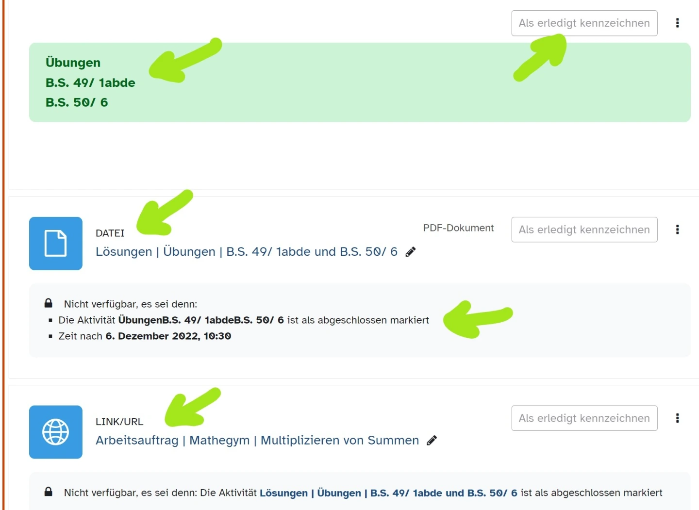 Jede Aktivität kann in der mebis Lernplattform mit Voraussetzungen versehen werden, wodurch der Zugriff an Bedingungen, z. B. den Abschluss einer vorherigen Übung oder einer Zeitstruktur, gebunden ist. -