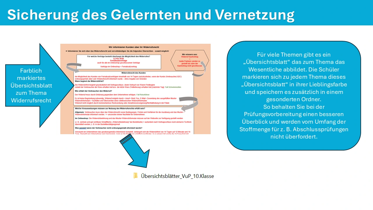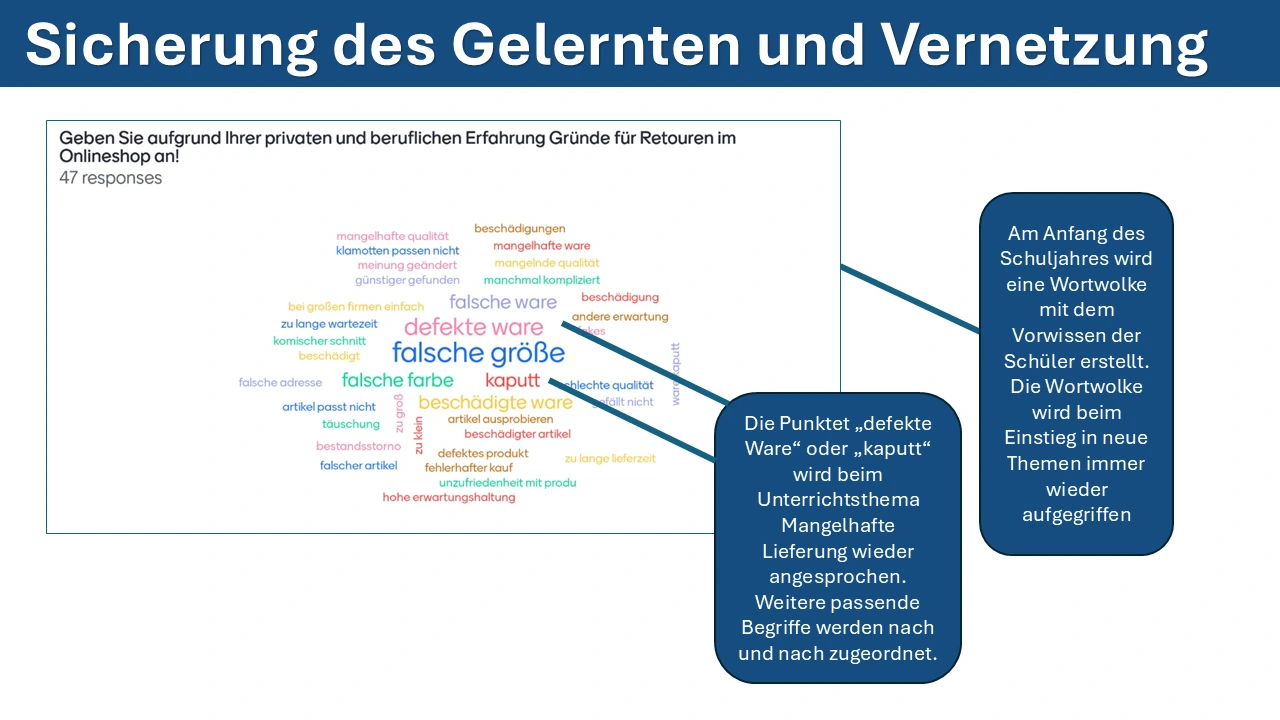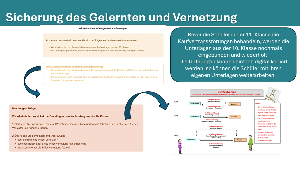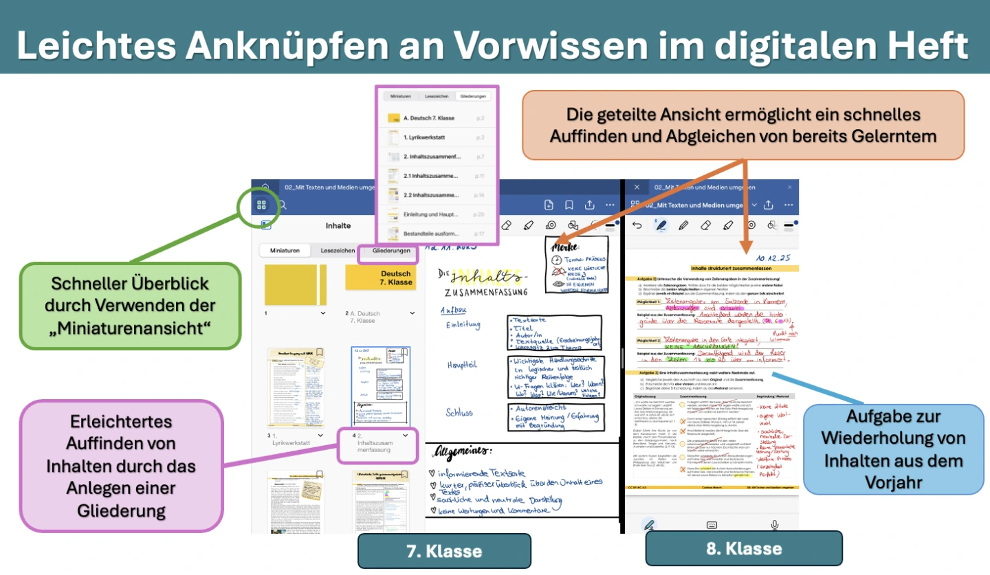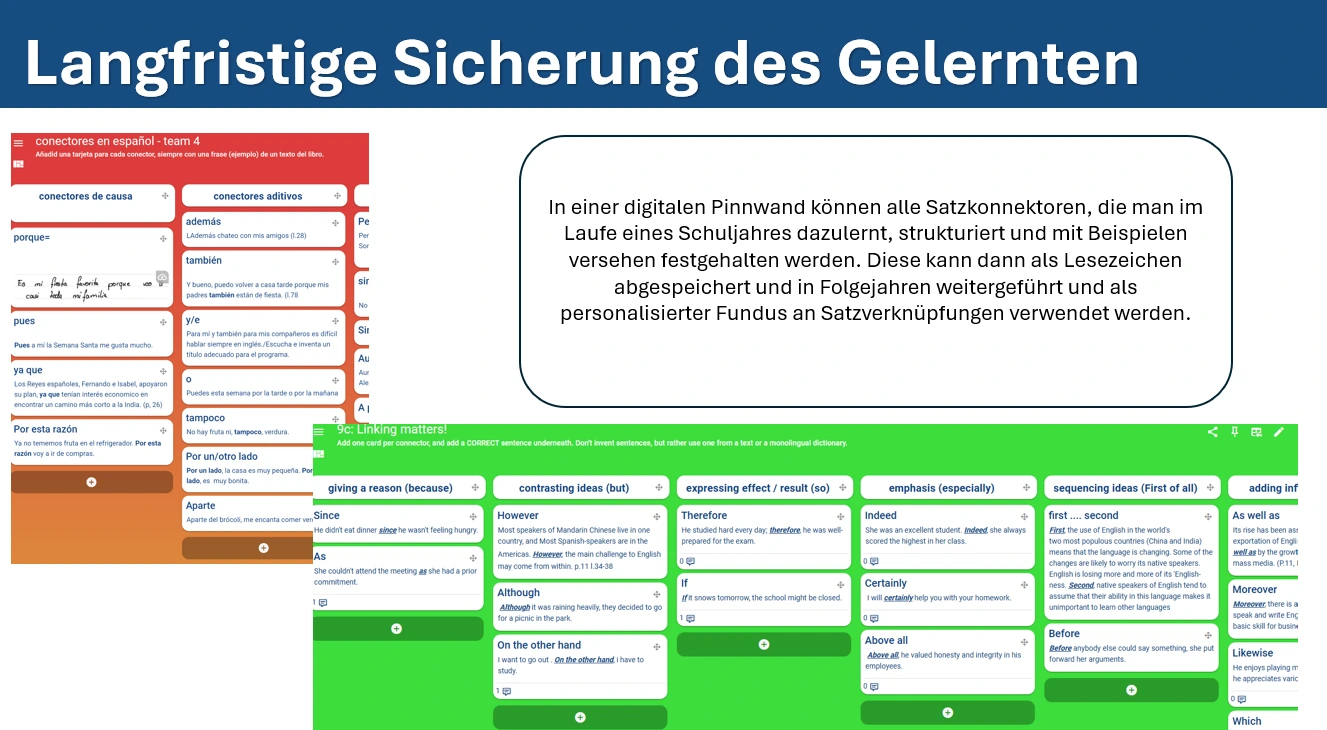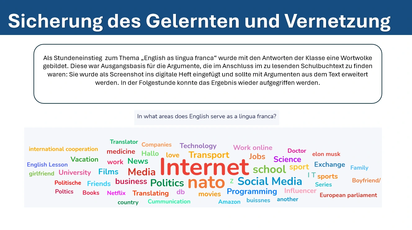 Der Vorteil digitaler Medien bei der Sicherung von Unterrichtsinhalten besteht darin, Vernetzungen und Querverbindungen zu anderen Themen oder Jahrgangsstufen einfacher herzustellen. Statt isoliertes Faktenwissen zu lernen, können Zusammenhänge besser erkannt und gefestigt werden. So ist es beispielsweise möglich, Hefteinträge, die digital gesichert werden, sowohl in Folgestunden als auch zu einem viel späteren Zeitpunkt wieder aufzugreifen und zu erweitern. Dies fördert das vernetzte Denken und das Bewusstsein, das Lernen als lebenslänglichen und kontinuierlichen Prozess wahrzunehmen.