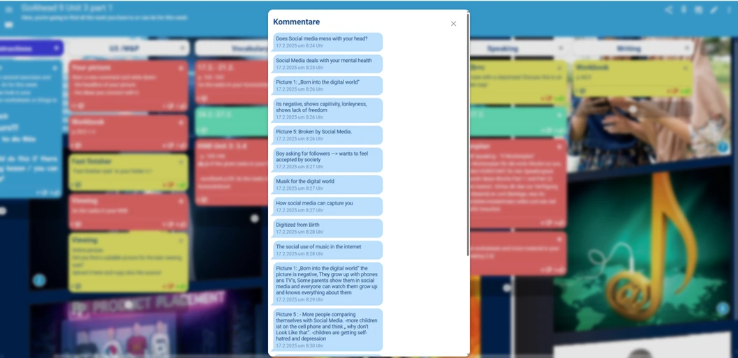 Die Schüler nutzen die Kommentarfunktion in einer TaskCard, um ihr bevorzugtes Bild zum Thema Social Media zu nennen und eine kurze Meinung dazu zu schreiben. Das Ergebnis dient als Diskussionsgrundlage. -