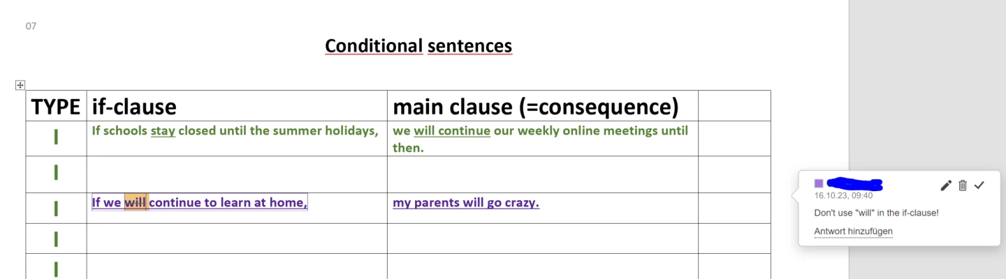 Beim kollaborativen Schreiben werden die Sätze der Mitlernenden kommentiert und ggf. korrigiert. Auf diese Weise reflektieren die Lernenden sowohl eigene als auch fremde Texte. Dabei können inhaltliche oder sprachliche Aspekte im Vordergrund stehen.