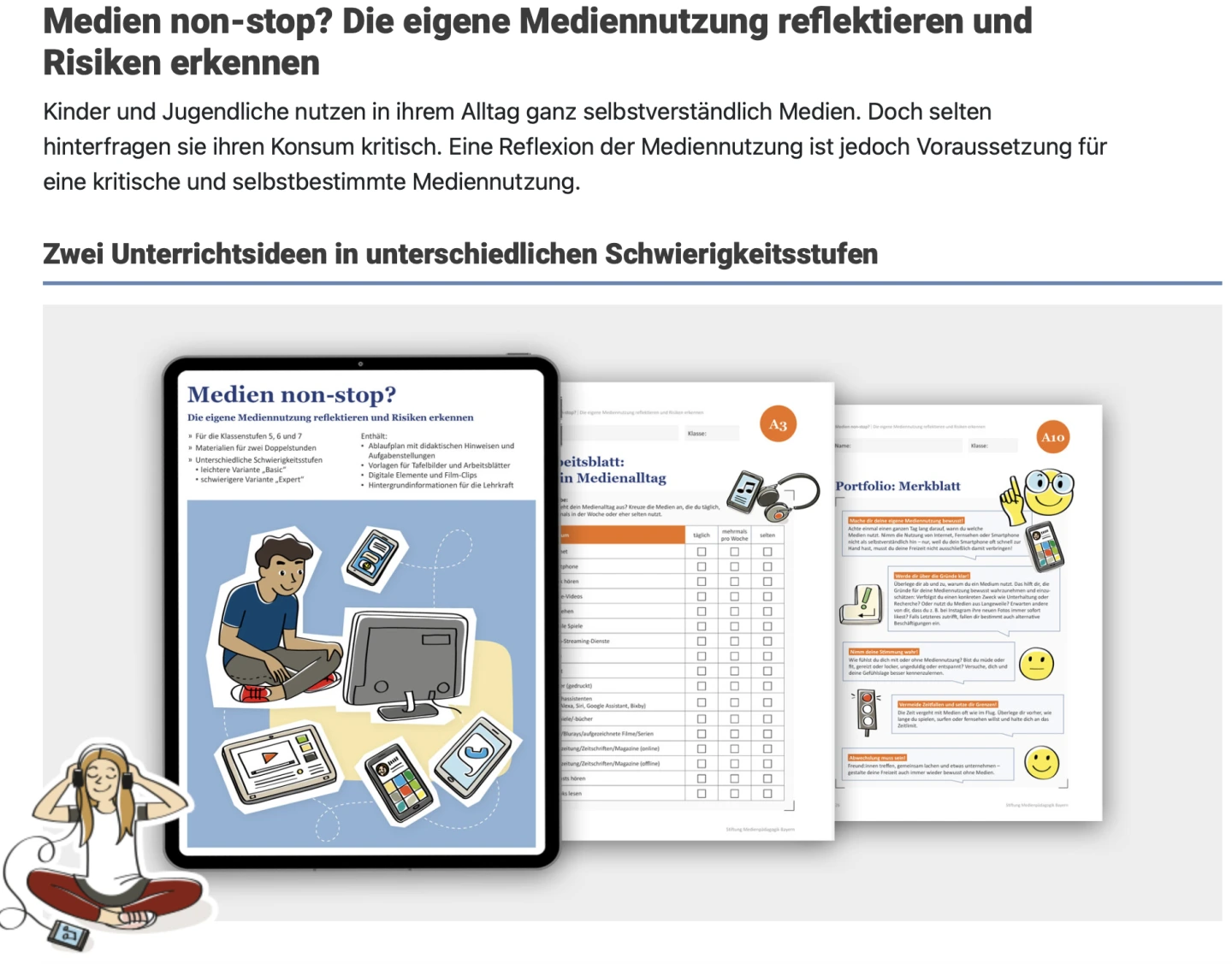 Für die gezielte Reflexion des alltäglichen Mediennutzungsverhaltens stehen insbesondere die Materialien des Medienführerscheins der BLM Stiftung Medienpädagogik für unterschiedliche Altersgruppen zur Verfügung.