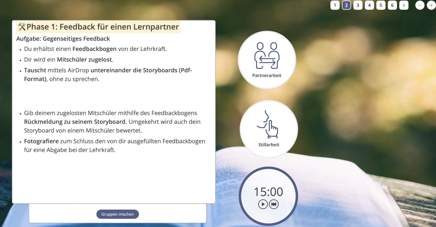 Digitale Medien erleichtern den Austausch von Lernprodukten sowie die Dokumentation und Sicherung des Arbeitsprozesses. Das anschließende Feedback findet in persönlicher Gesprächsrunde statt, wodurch ein direkter und konstruktiver Austausch zwischen den Lernenden gefördert wird.